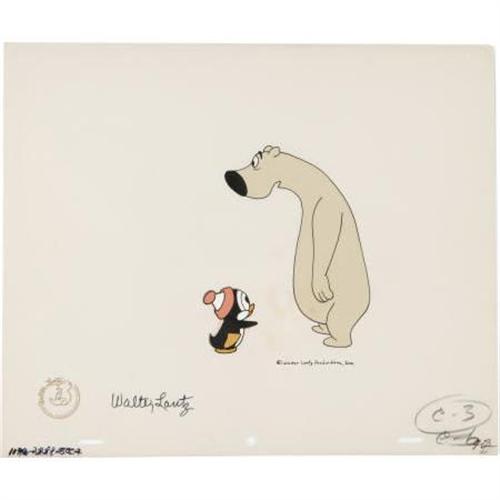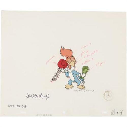 <B>Walter Lantz Animation Production Cel, Animation Production Drawing, and Limited Edition Print, Group of 22 (Lantz Productions, 1970-92).</B></I> This selection includes four original hand-inked and hand-painted production cels featuring Woody Woodpecker, Chilly Willy, and Maxie the Polar Bear (most cels include their clean-up drawings). Also includes three additional original animation production drawings of Woody, and a random Lantz character. The prints included are "Moneybags Woody" (#7/200), "Chillys Fishing Hole" (AP#7/10), "Fly Ball" (#124/200), "Fish Locker" (#152/200), "Rooftop Woody Woodpecker" (#152/200), "Woody Gets a Hit" (#154/200, signed by Reggie Jackson), and "In The Rough" (AP#9/10, signed by Ray Floyd), all signed by Lantz. Most items include a certificate of authenticity. Also includes four payroll checks signed by Walter Lantz.<BR><BR><b>Shipping:</b> Flat Material, Small (<a target="_blank" href="http://www.heritageauctions.com/common/shipping.php">view shipping information</a>)