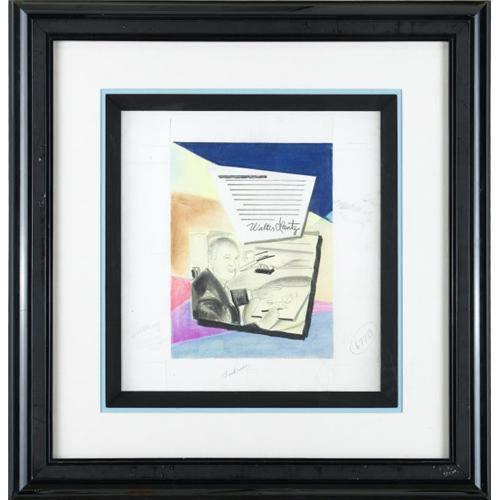 <B>Walter Lantz Preliminary Back Cover Sketch Original Art (undated).</B></I> This colored pencil rough shows Walter Lantz at the drawing board, flashing the smile known by kids all over the world by way of television's "Woody Woodpecker Show", so popular during the 1960s. The image area measures 8" x 10.5" on a sheet size of approximately 13" x 14"; it's been professionally matted and framed to an overall size of 24" x 25". In Very Good condition.