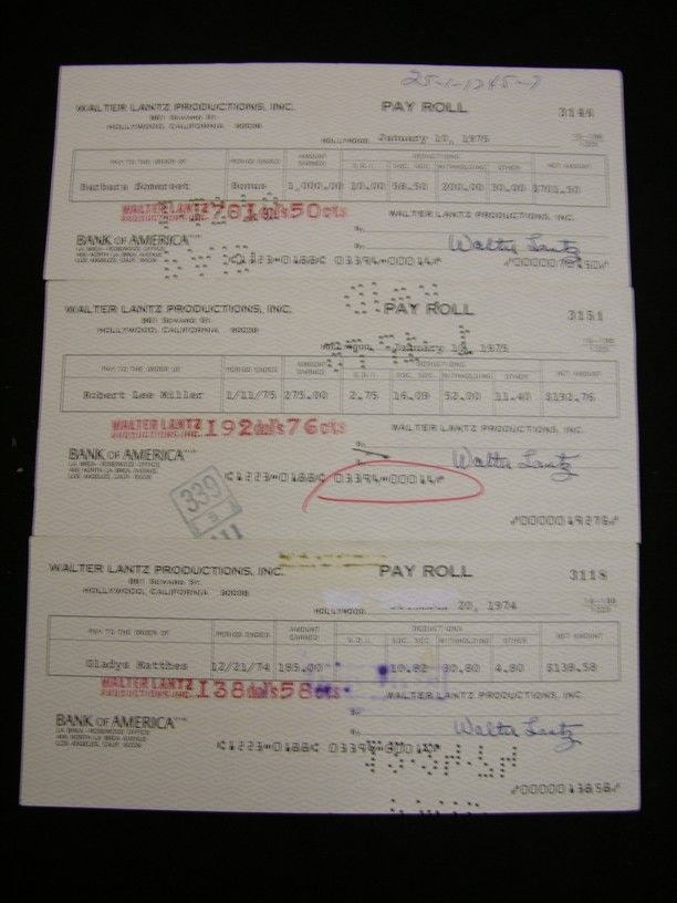 Three signed checks from Walter Lantz Productions, dated 1974 and 1975, to various employees. All three checks are signed by Lantz and bear his company name at the top. (approx. 8 1/2" long)