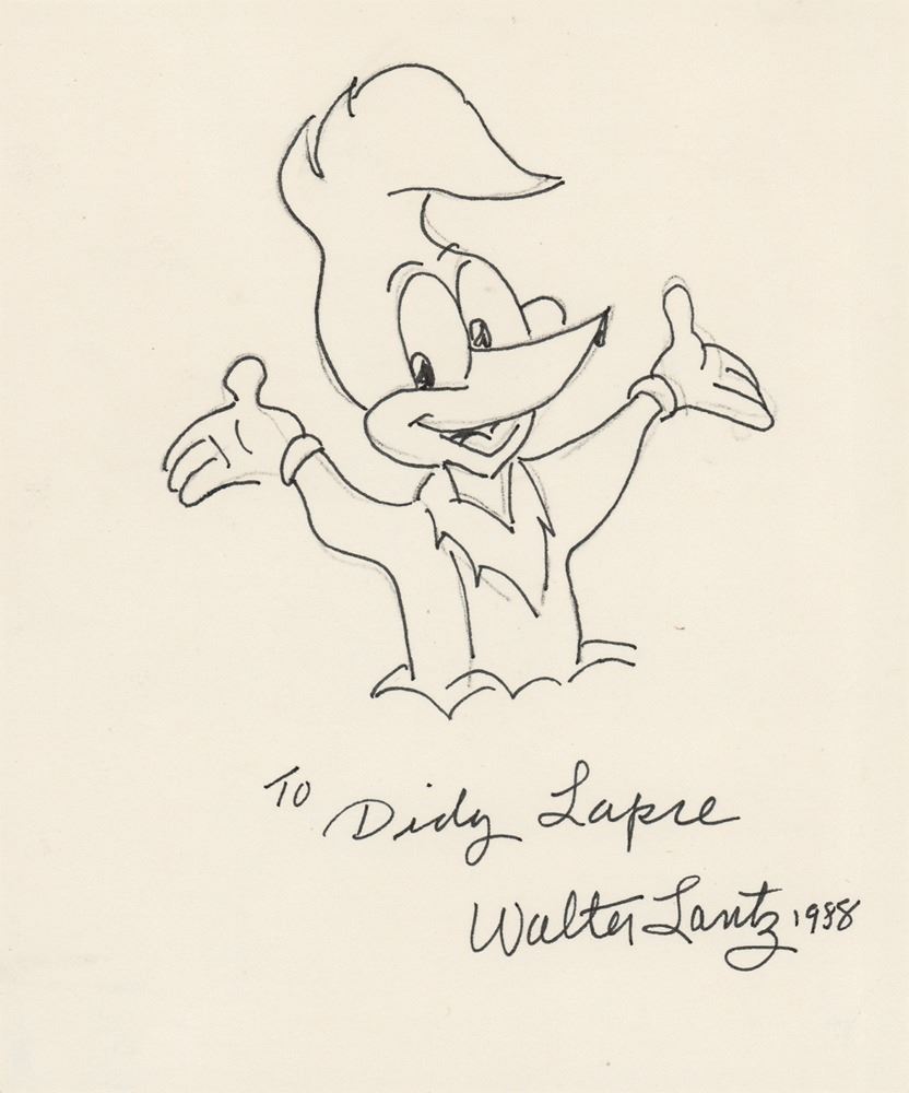 Original signed felt tip sketch of Woody Woodpecker on an off-white 5 x 6 card, signed and inscribed below, "To Didy Lapre, Walter Lantz, 1988." In very fine condition.