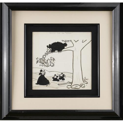 <B>Walter Lantz - "Waiting For the Break" Illustration Original Art (1927).</B></I> Talk about being in a bad spot -- this poor hunter is really "up a tree" in more ways than one! This amusing ink and grey wash drawing is dated "27" -- that's two years before Mr. Lantz arrived at Universal Studios to begin producing the "Oswald" cartoons. This drawing was probably created during the time Lantz worked as an animator for the John Bray studios, and could have been part of the "Unnatural History" series. The art measures approximately 11" x 11", and is matted and framed to an overall size of 23.75" x 23. The art and mat are in Excellent condition, and the frame is in Very Good condition.