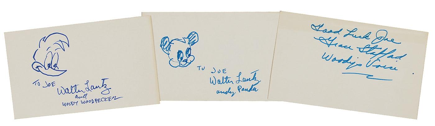 Original in-person signed and inscribed felt tip sketches of Andy Panda and Woody Woodpecker on individual off-white 5 x 3 cards. Also included is an in-person ink signature and inscription of Grace Stafford, Lantz’s wife, and the voice of Woody Woodpecker. In fine condition, with some mild toning to top of Stafford’s signature.