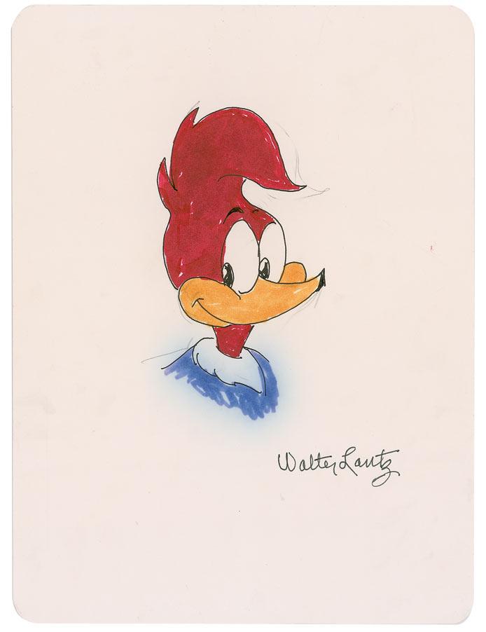 Original signed ink, pencil, and felt tip sketch of Woody Woodpecker on an off-white 7 x 9.25 card. In fine condition.