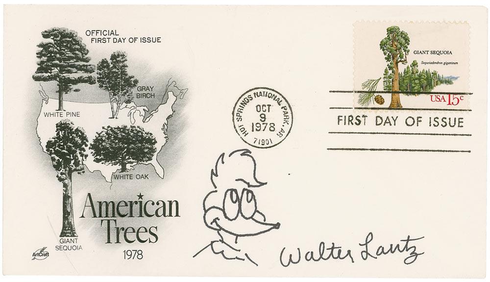 Original signed felt tip sketch of Woody Woodpecker on a First Day Cover honoring American Trees, signed “Walter Lantz.” In fine condition.