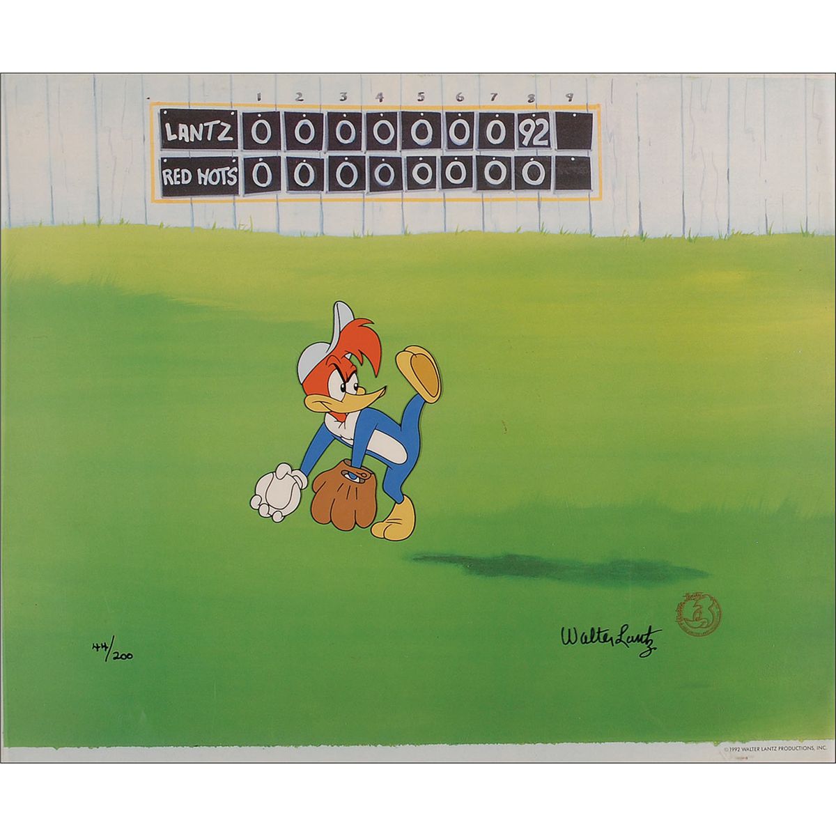 Limited edition hand-painted baseball-themed animation cel featuring Woody Woodpecker, #44/200,16.5 x 13.5, set against a pre-printed color background, signed in black felt tip by Lantz. Print features an official Walter Lantz Productions gold seal, dated 1992. In fine condition, with minor corner creasing and light surface rubbing.