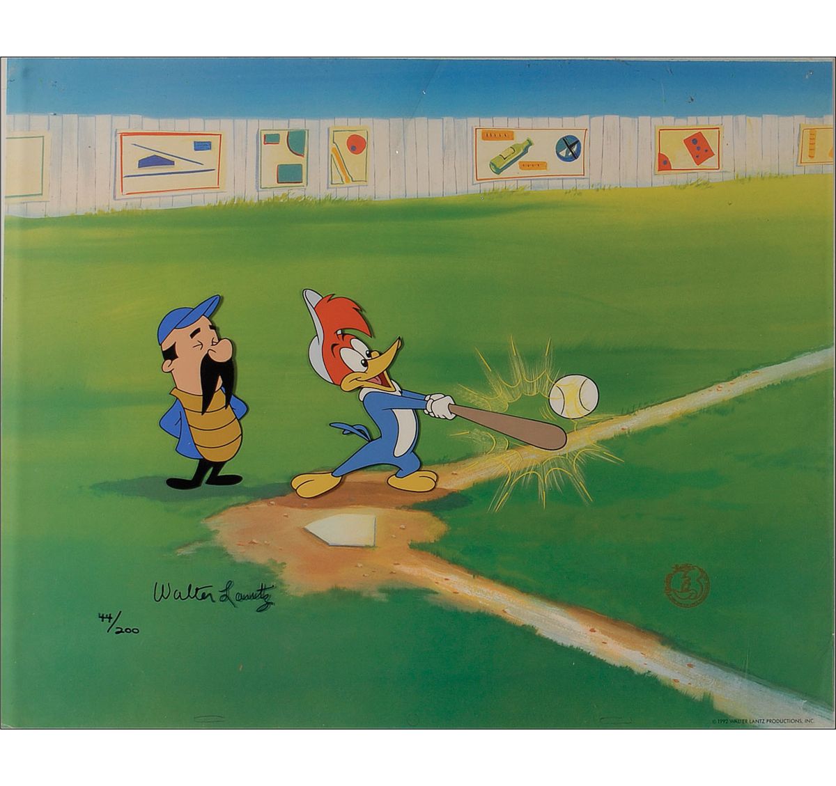 Limited edition hand-painted animation cel, 16.5 x 13.5, #44/200, depicting Woody Woodpecker at bat during a baseball game, signed in black felt tip by Lantz, and presented against a pre-printed color background. In fine condition, with a light diagonal crease to cel.