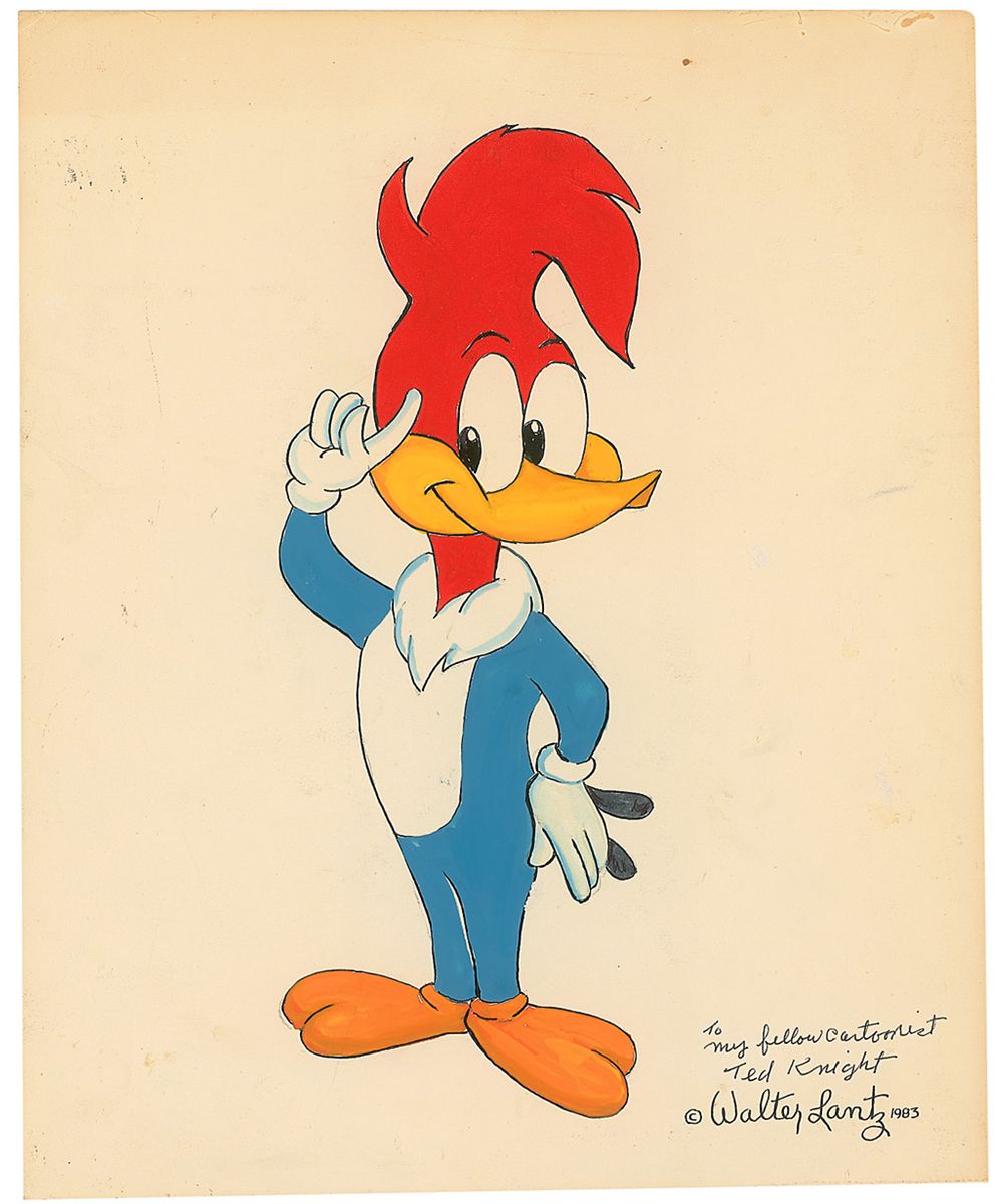 Original signed and inscribed ink and paint sketch of Woody Woodpecker on an off-white 11 x 13.25 piece of artist’s board. Signed and inscribed at the bottom, “To my fellow cartoonist Ted Knight, © Walter Lantz 1983.” In fine condition, with some scattered light toning and soiling to background.