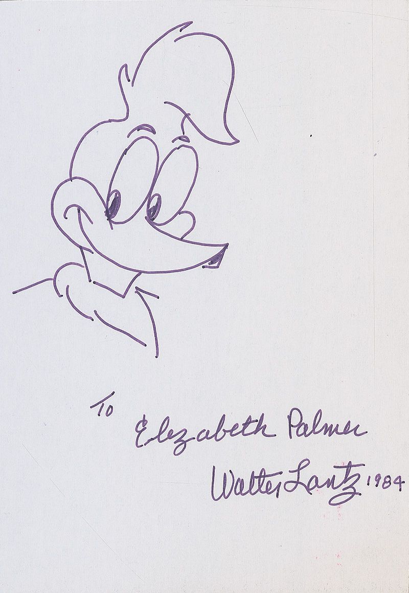 Original felt tip sketch of Woody the Woodpecker on an off-white 4.25 x 6 card, signed and inscribed “To Elizabeth Palmer, Walter Lantz 1984.” In fine condition.