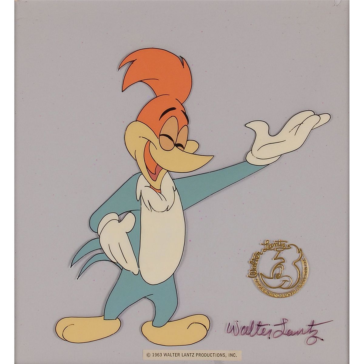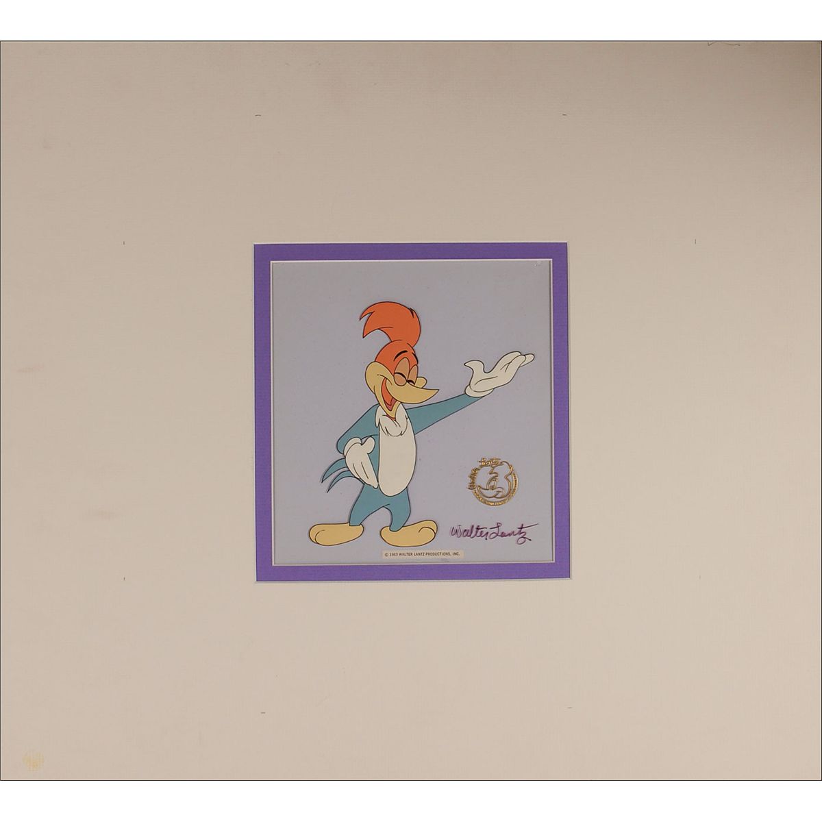 Original hand-painted production cel of Woody Woodpecker, 6.5 x 7, signed in the lower right in black felt tip by Lantz. Double-matted and framed to an overall size of 19.5 x 17.5. In fine condition, with a few light surface impressions.