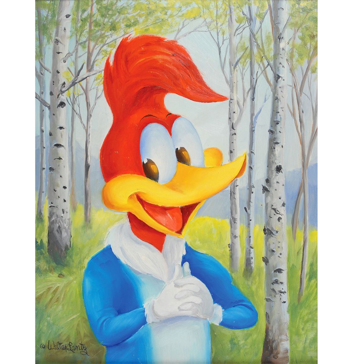 Incredible original painting by Walter Lantz, oil painting on canvas, 10.5 x 13.5, depicting Woody Woodpecker in a birch tree forest. Painting is signed in black paint in the lower left, “Walter Lantz.” Reverse of the canvas also bears an affixed ‘Walter Lantz Happy Art’ label and a Lantz copyright stamp. Ornately matted and framed to an overall size of 18 x 21. In fine condition. A phenomenal close-up painting of Lantz’s most famous character. Accompanied by a full letter of authenticity from PSA/DNA.