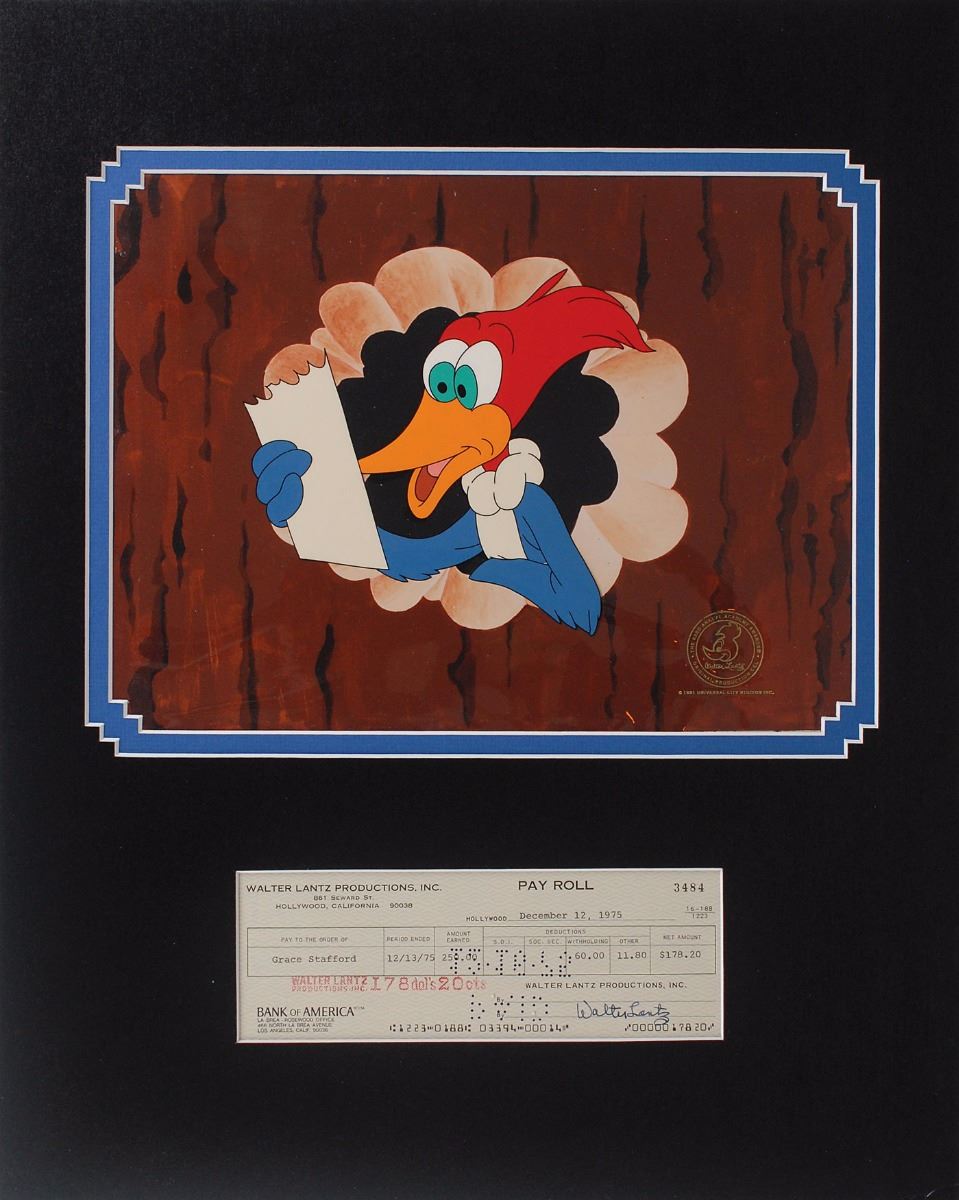 Two items: an original hand-painted production cel featuring Woody Woodpecker from the 1991 Academy Awards, placed on a color copy background, 12.25 x 9, showing the bird reading from a sheet; and a Walter Lantz Productions business check, 8 x 2.75, filled out in type and signed by Lantz, December 12, 1975. Double-matted together to an overall size of 16 x 20. In fine condition, with expected cancellation holes to the check. Accompanied by a certificate of authenticity from MCA/Universal Studios.
