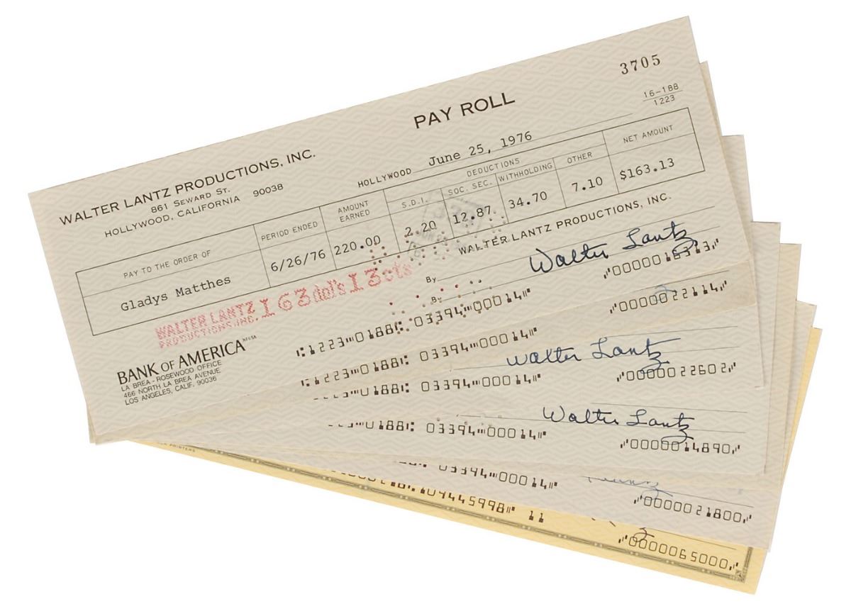 Collection of seven Walter Lantz Productions checks, dated from 1971 to 1984, each signed by Lantz. In overall fine condition.