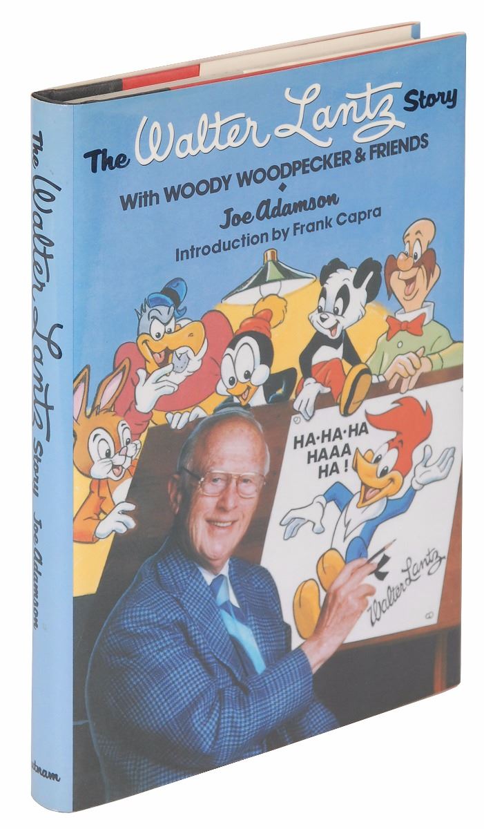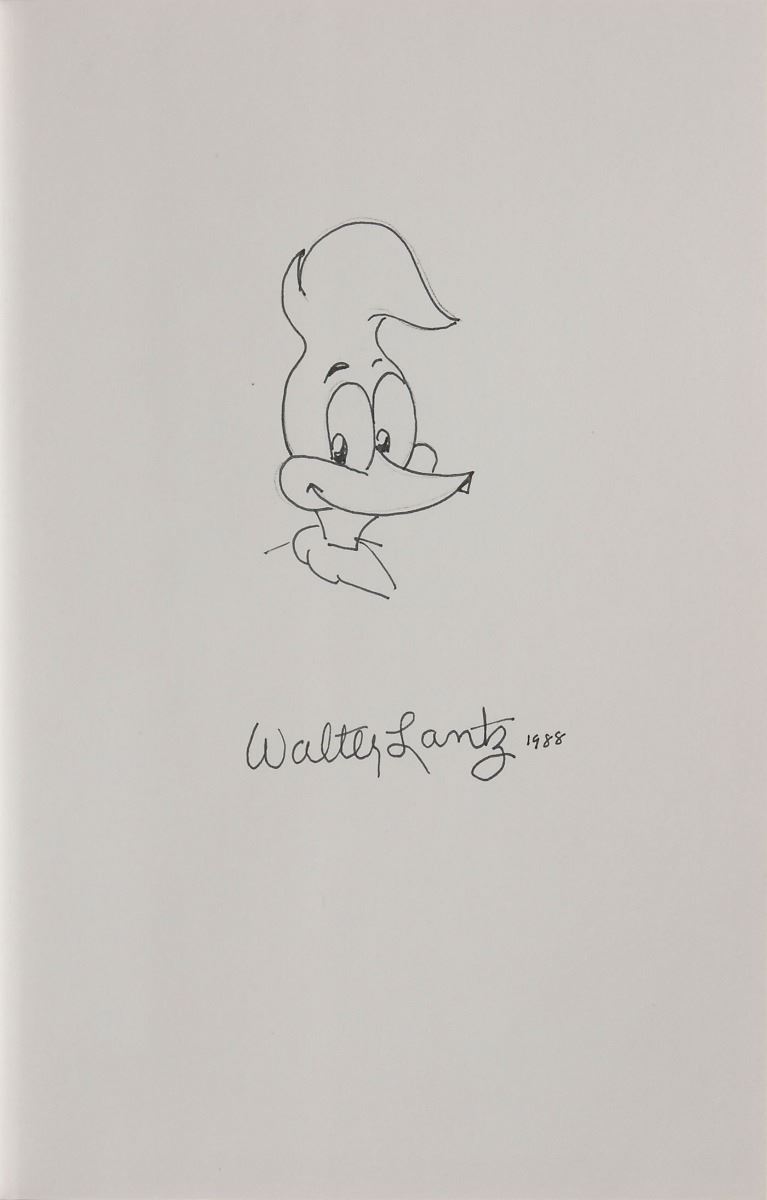 Signed book: The Walter Lantz Story. First edition. NY: G.P. Putnam’s Sons, 1985. Hardcover with dust jacket, 6.25 x 9.25, 254 pages. Signed on the first free end page in black ink, “Walter Lantz, 1988,” adding a wonderful ink sketch of Woody Woodpecker. In fine condition.