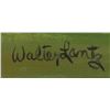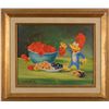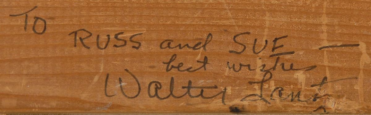Extremely scarce original painting by Walter Lantz, oil on canvas, 9.5 x 7.5, showing Woody Woodpecker next to a bowl of fruit. Painting is signed in black paint in the lower left, “Walter Lantz,” and signed and inscribed on the wooden canvas stretchers on the reverse, “To Russ and Sue—best wishes, Walter Lantz.” Reverse of the canvas also bears a partially affixed ‘Walter Lantz Happy Art’ label and a Lantz copyright stamp. Attractively cloth-matted and framed to an overall size of 14 x 12. In fine condition, with a few chips and marks to stretchers affecting a bit of the last name of signature. An outstanding and highly desirable painting of Lantz's most famous character—a vivid, spectacular piece.