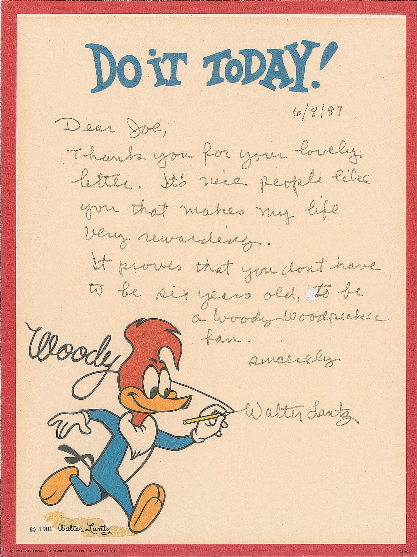 ALS, one page, 6 x 8, colorful Woody Woodpecker letterhead, June 8, 1987. In full: "Thank you for your lovely letter. It's nice people like you that makes my life very rewarding. It proves you don't have to be six years old, to be a Woody Woodpecker fan." Affixed to a same-size mount and in fine condition.