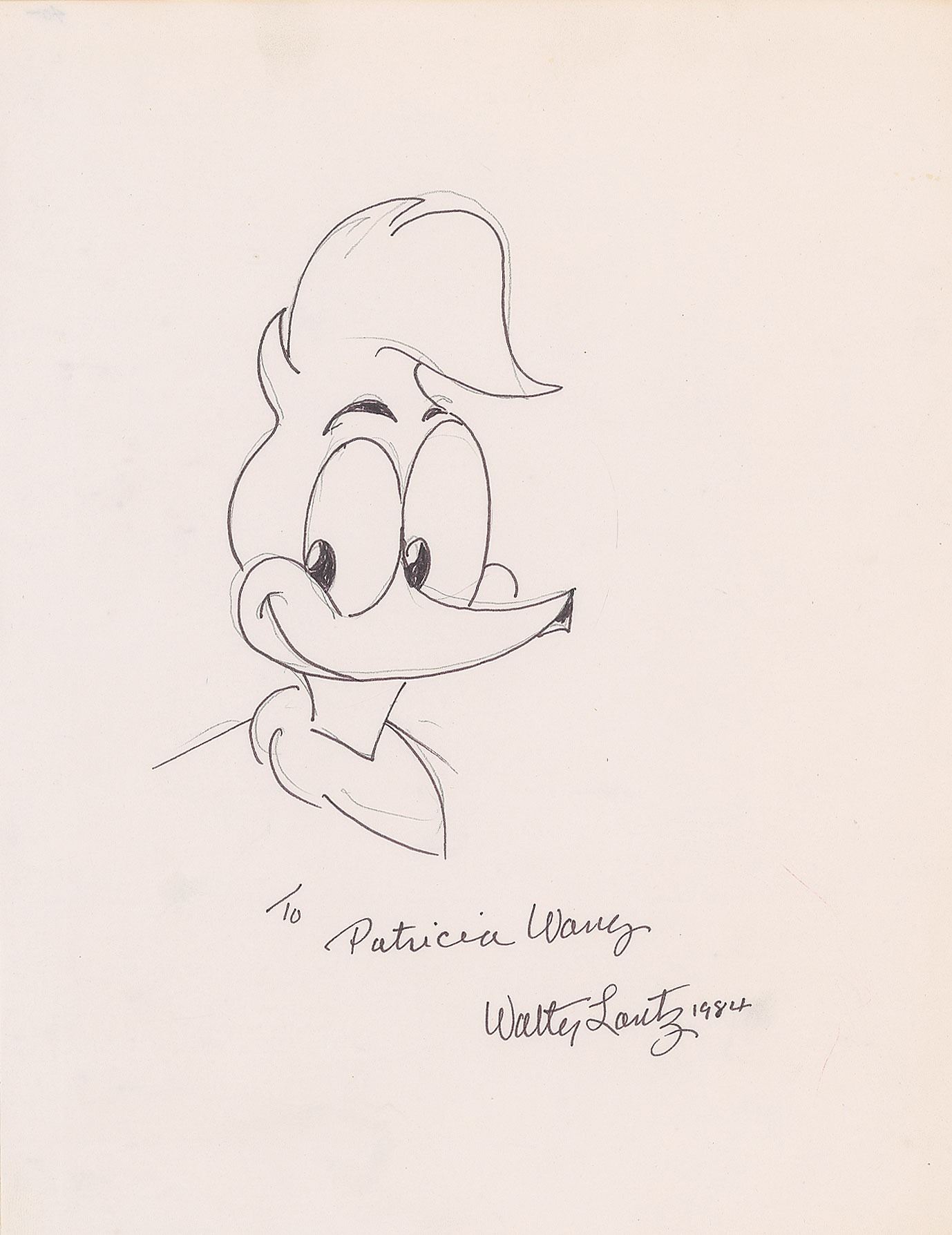 Original graphite and felt tip sketch of a smiling Woody Woodpecker, accomplished on an off-white 8.5 x 11 sheet by Walter Lantz, who dates the sketch to 1984 and adds an inscription. In fine condition.