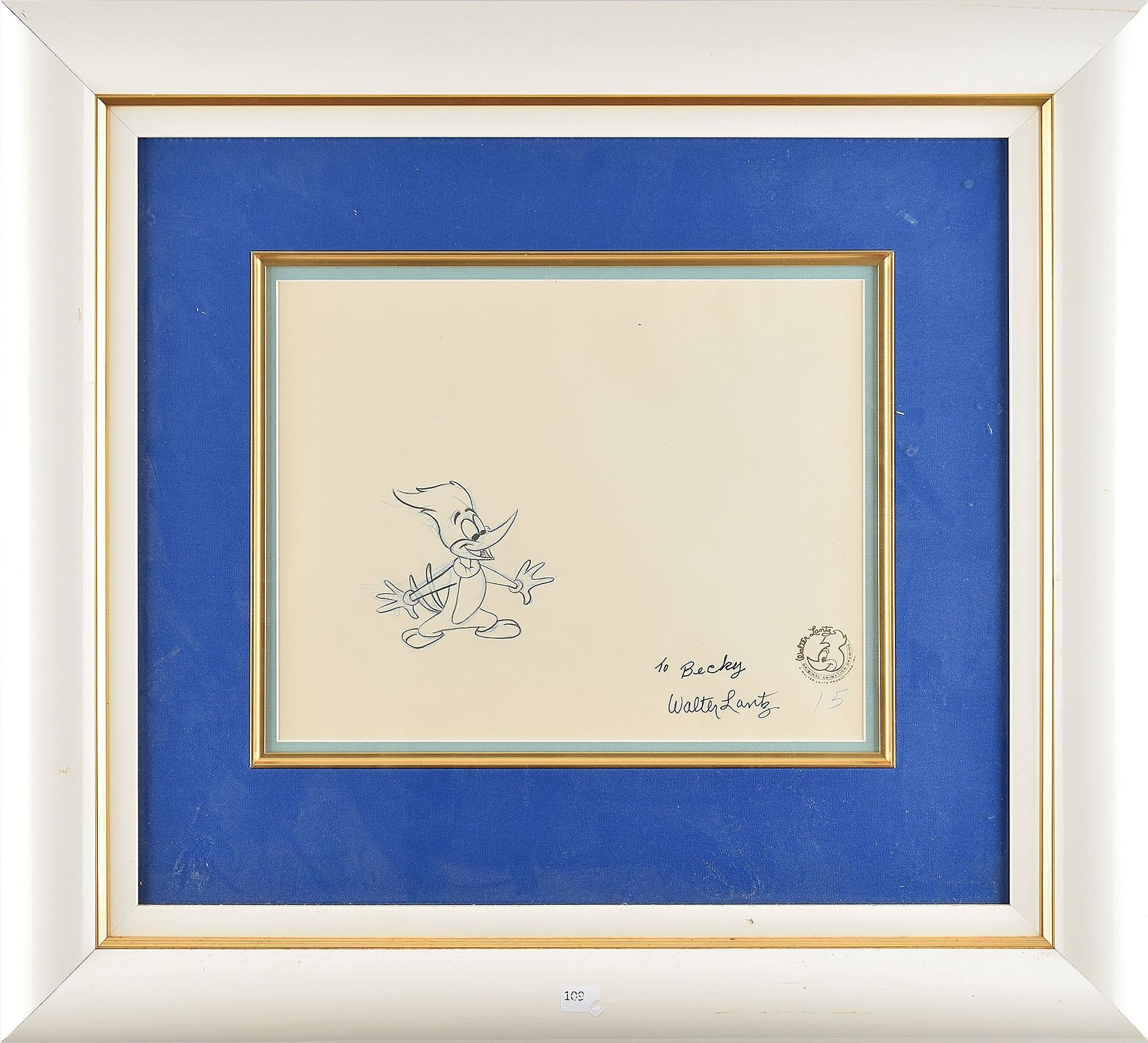 Two original production drawings by Walter Lantz, both accomplished in graphite or colored pencil on off-white animation sheets, 11 x 9 and 12 x 9.5, with one depicting Woody Woodpecker in a jubilant full-length pose, signed and inscribed in black felt tip, "To Becky, Walter Lantz," and the other showing Andy Panda in two poses, signed by Lantz in black ink. Both feature gold Walter Lantz stamps. Individually matted and framed to overall sizes of 18 x 16 and 23 x 21. In overall fine condition, with a crease to the Andy Panda drawing.