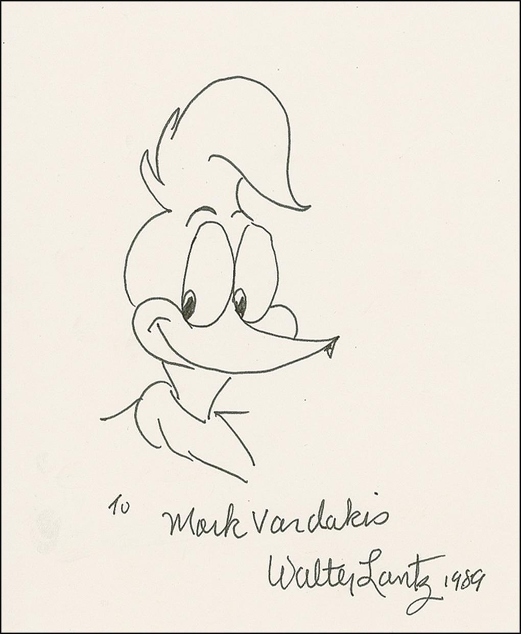 Original signed and inscribed ink sketch of Woody Woodpecker on an off-white 5 x 6 card, signed and inscribed at the bottom, “To Mark Vardakis, Walter Lantz 1989.” In very fine condition.