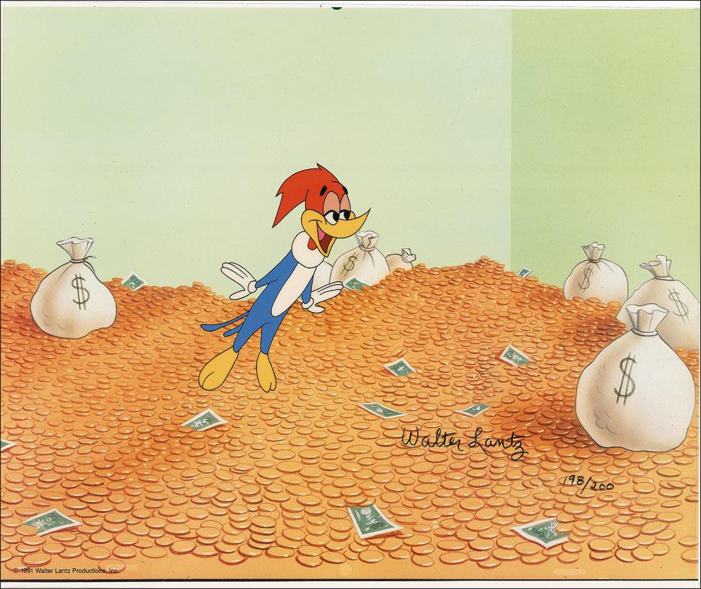 Limited edition hand-painted animation cel entitled ‘Moneybags Woody,’ 12 .5 x 10, #198/200, showing Woody Woodpecker in a roomful of money, signed in black felt tip by Lantz, and set against a pre-printed color background. In fine condition.