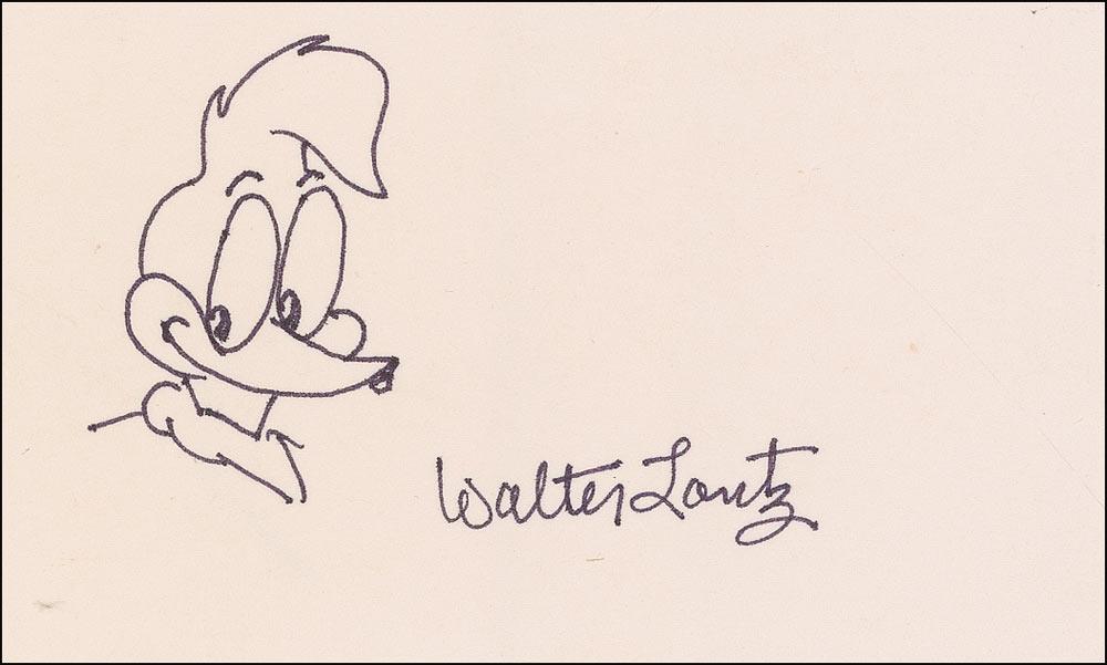 Original signed felt tip sketch of Woody Woodpecker on an off-white 5 x 3 card. In fine condition.