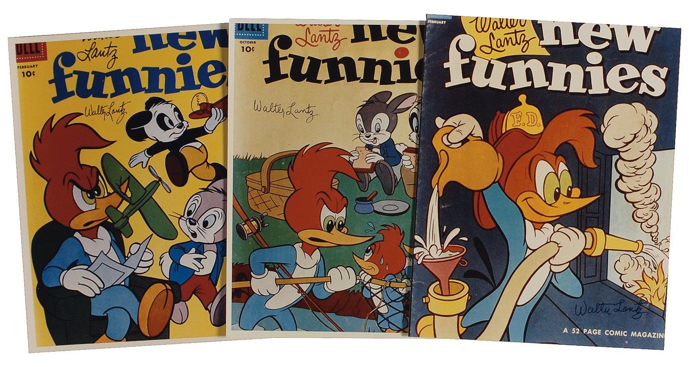 Three glossy 8 x 10 photos of classic Woody Woodpecker comic book covers, each signed in black or blue felt tip, “Walter Lantz.” In overall fine condition, with each cover image slightly cropped.
