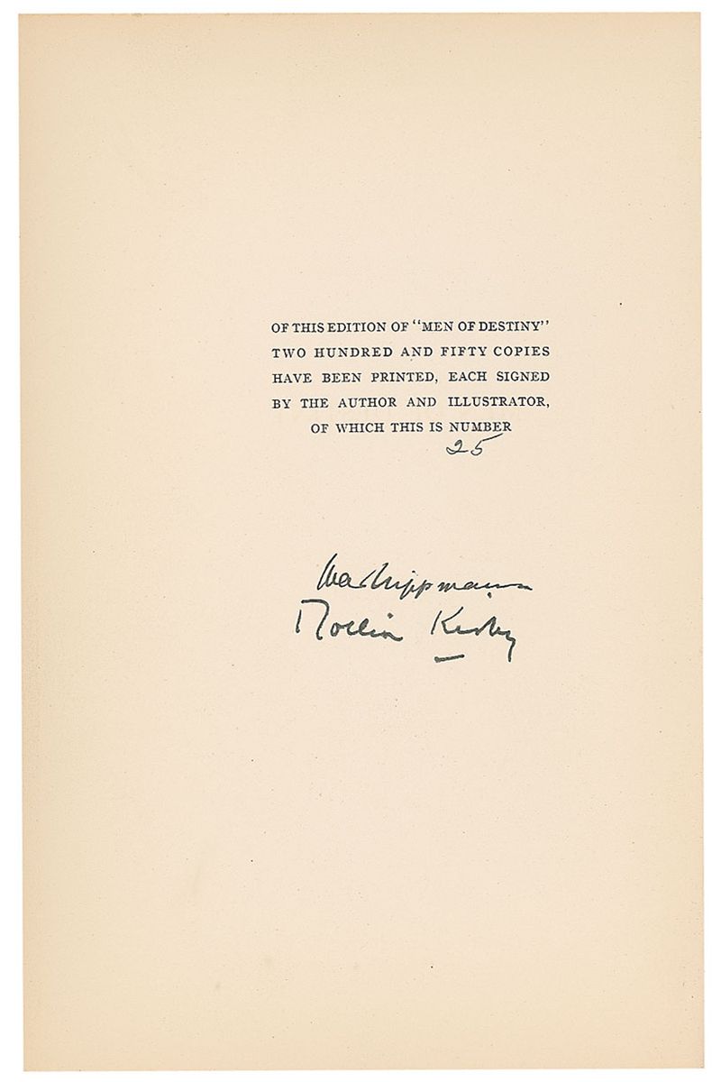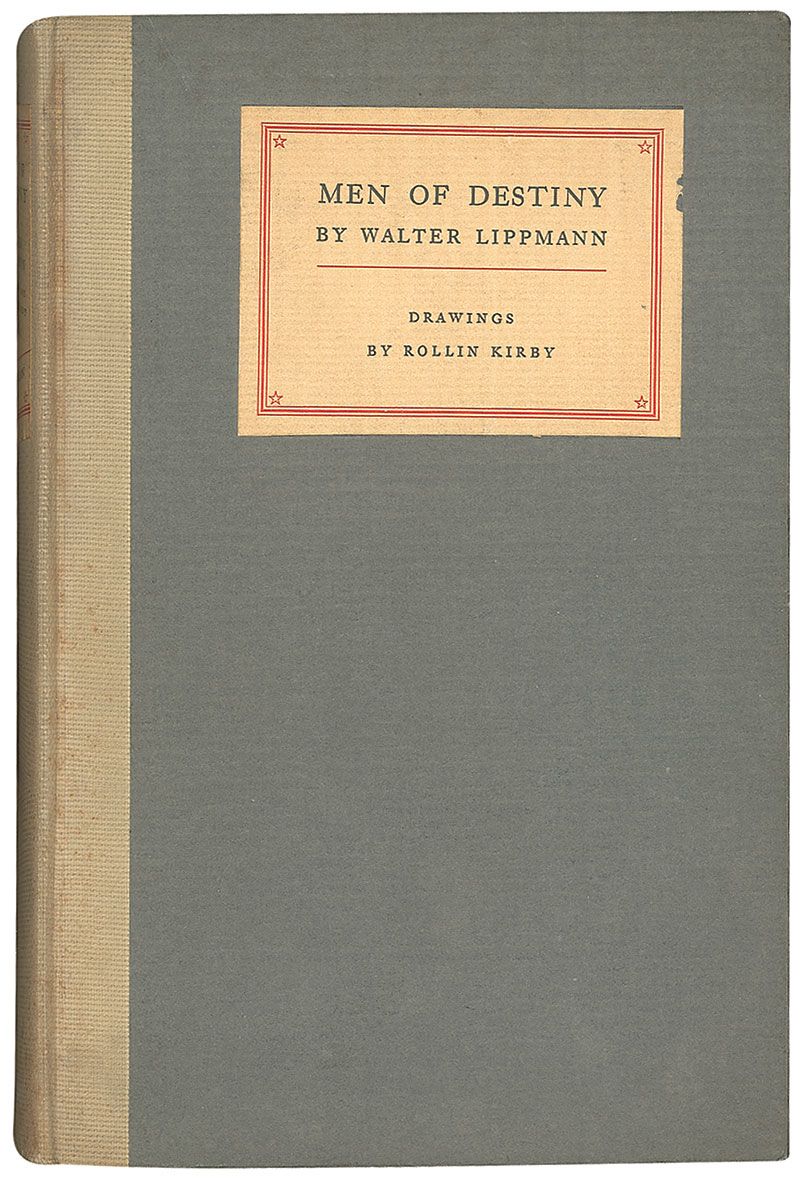 Pulitzer Prize–winning journalist and author (1889–1974), founder and associate editor of New Republic, who was among the first to introduce the concept of Cold War. Signed book: Men of Destiny. Limited edition of 250 copies (this being No. 25). NY: Macmillan Company, 1927. Hardcover, 5.75 x 8.5, 244 pages. Signed in black ink on the colophon by Lippmann and illustrator Rollin Kirby. Light toning to rear pastedown and fore-edges, and toning and wear to covers and spine, otherwise fine condition.