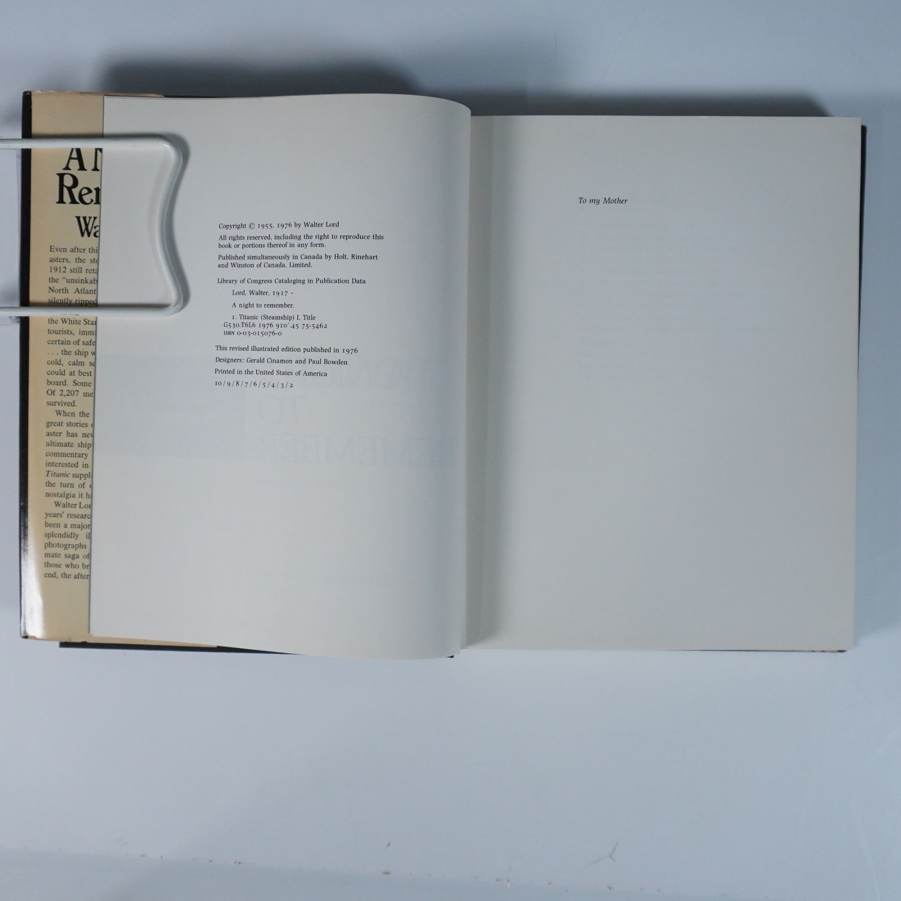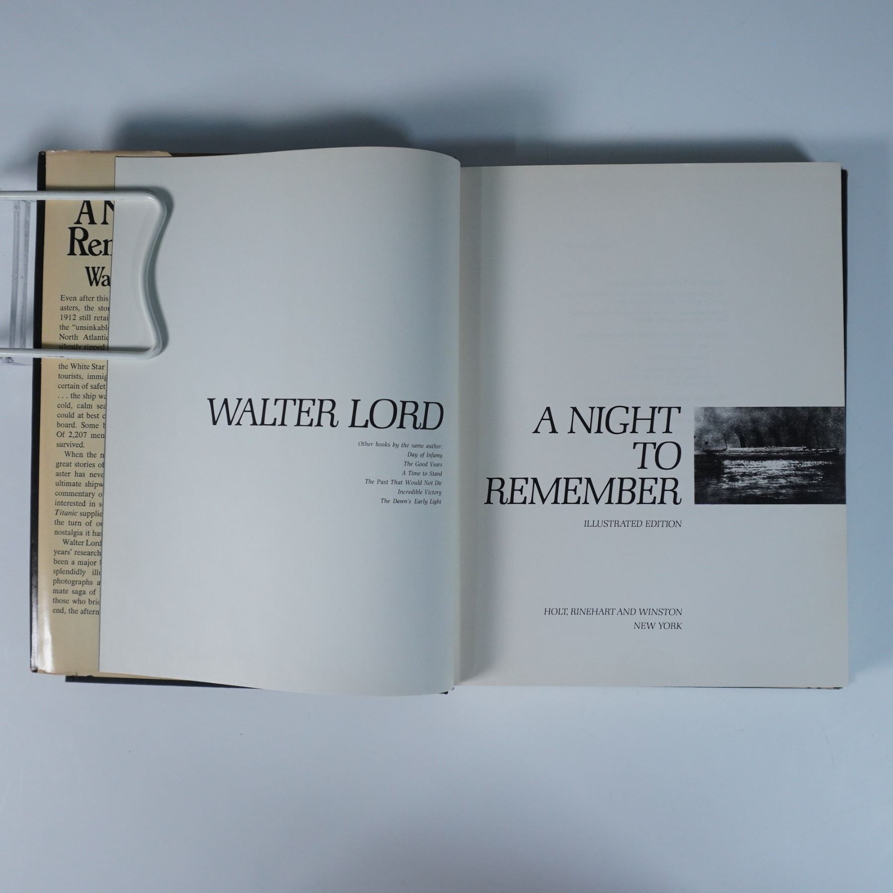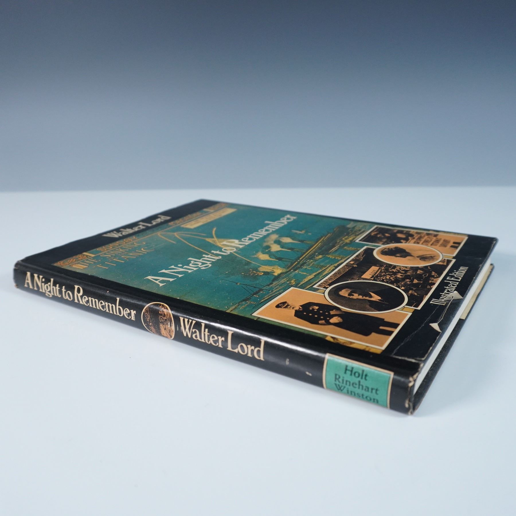This lot features the 1976 illustrated edition of A Night to Remember by Walter Lord, published by Holt, Rinehart and Winston. A definitive account of the Titanic disaster, the book vividly reconstructs the events of the sinking through survivor accounts and archival research. This edition includes historical photographs and illustrations that enhance the storytelling. The hardcover book retains its original dust jacket, which shows signs of wear. A significant collectible for Titanic enthusiasts and history collectors. Measures 7.5"L x 10"H.