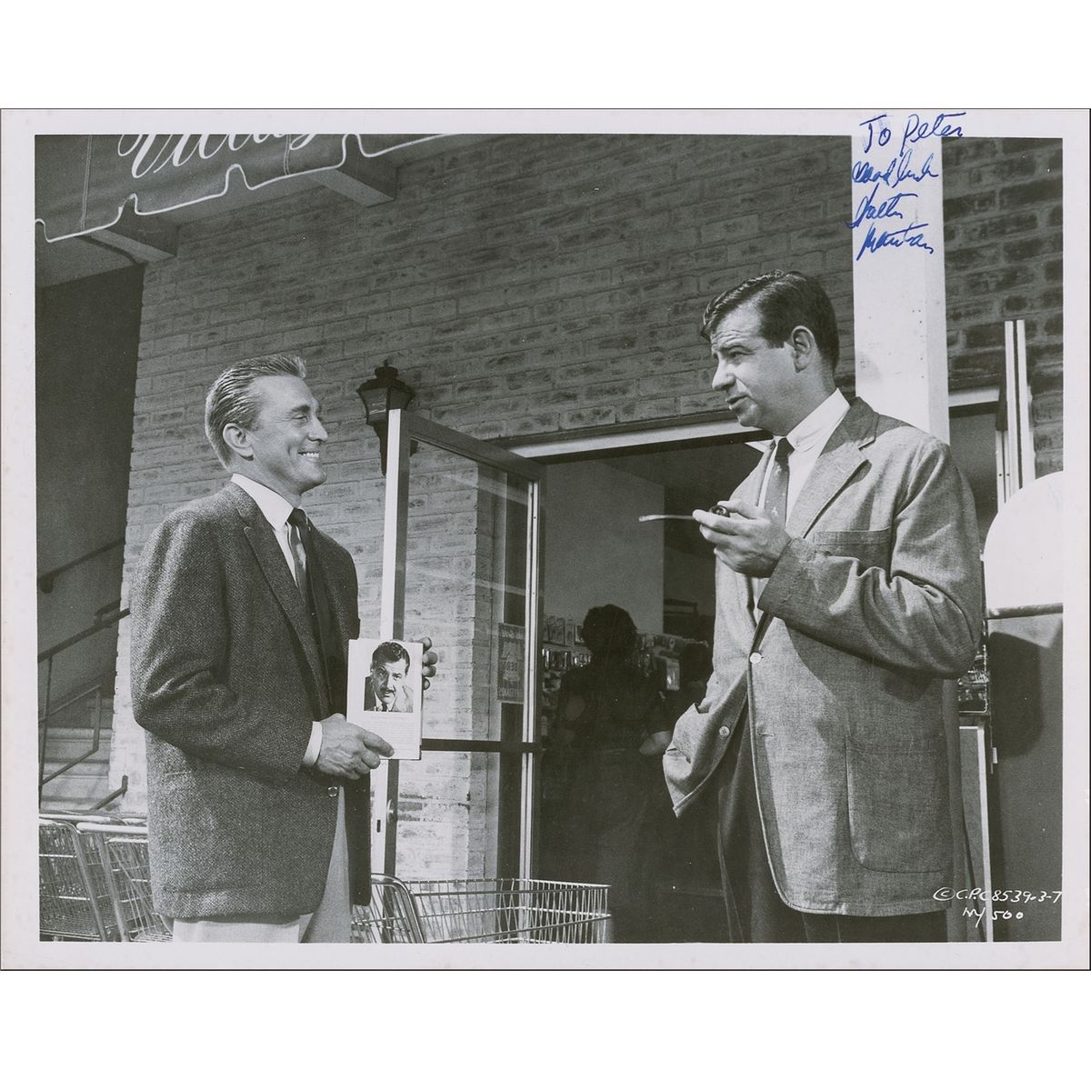 Vintage glossy 10 x 8 publicity photo of Matthau and Kirk Douglas from Strangers When We Meet, signed and inscribed in-person in fountain pen, “To Peter, Good luck, Walter Matthau.” In fine condition, with light brushing to the signature and inscription.