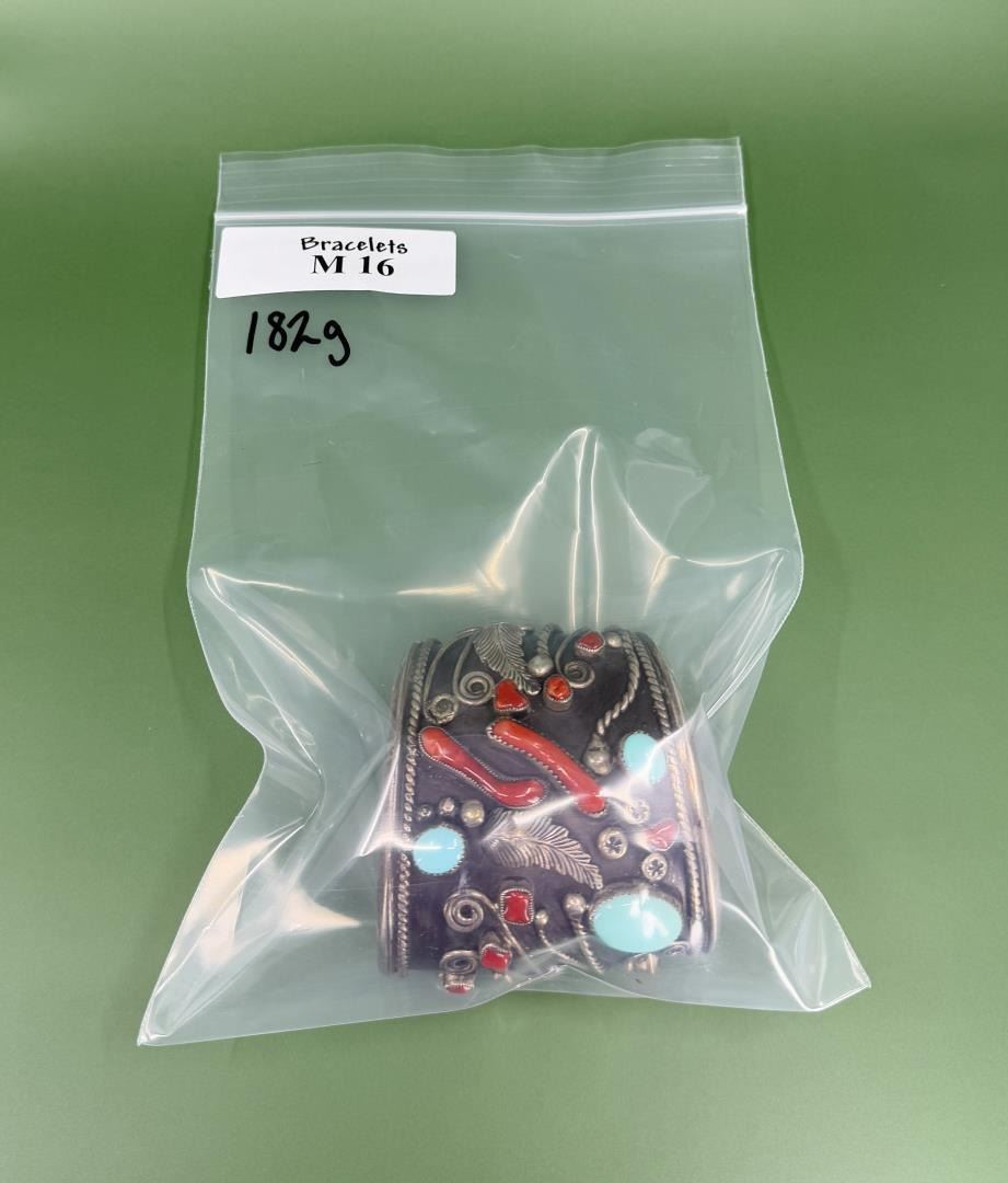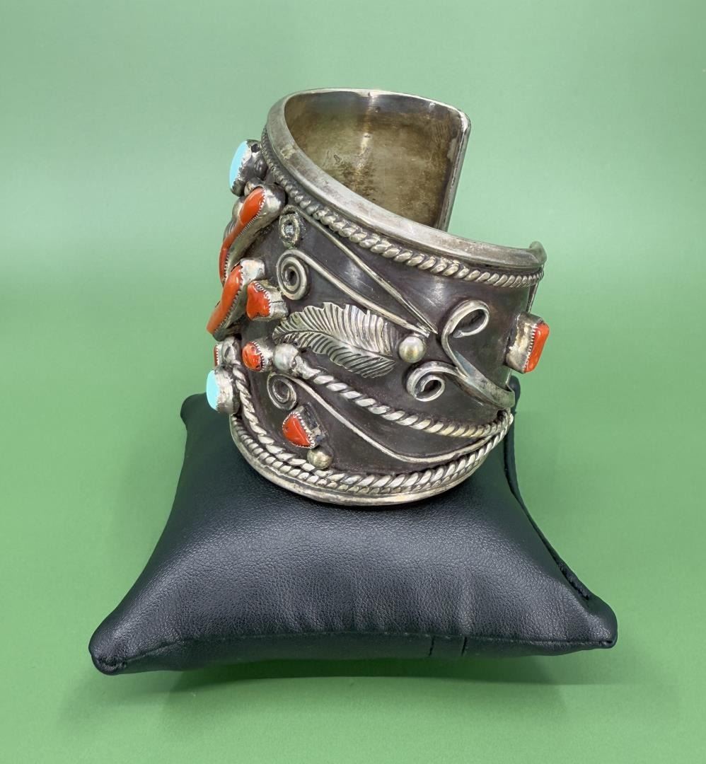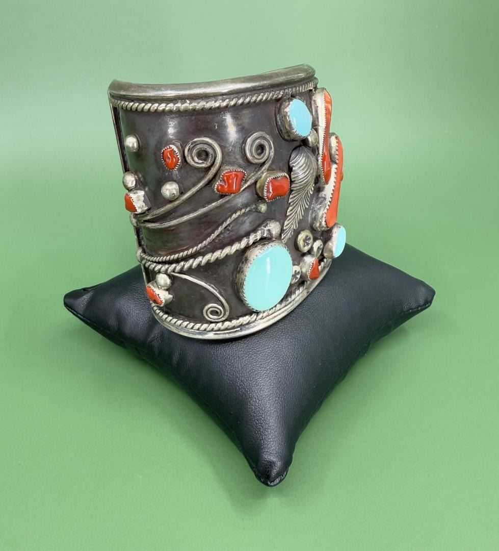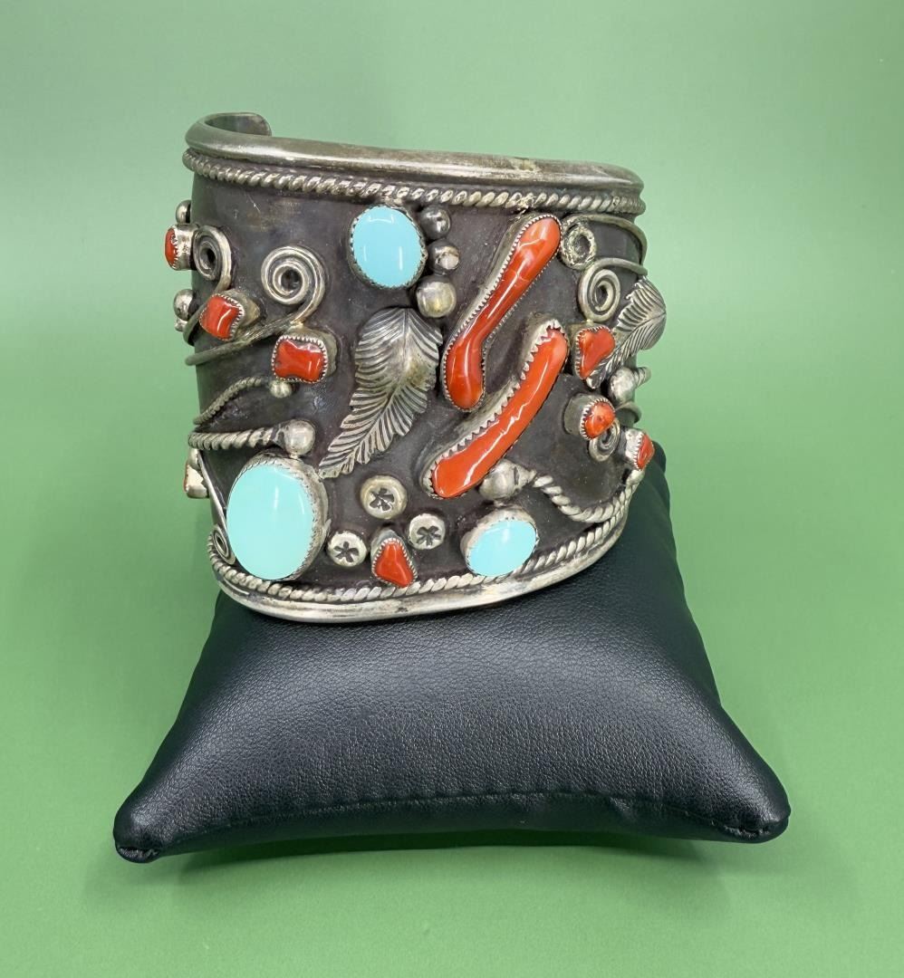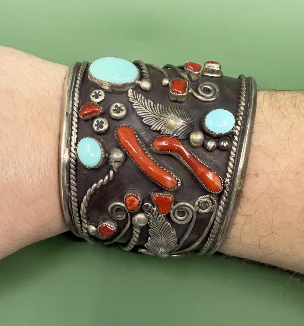 Stunning and Large Old Pawn Sterling Silver Cuff Bracelet. Set with Turquoise and Coral. 3" by 2 7/8" by 2 1/4". 182 grams.