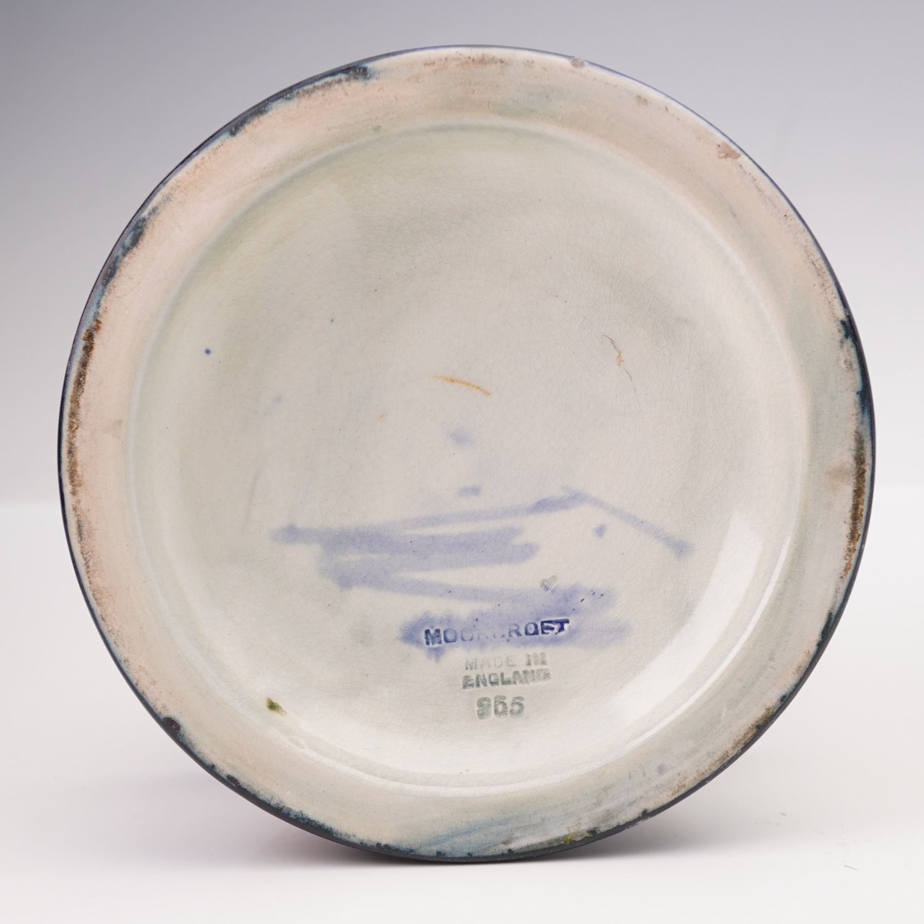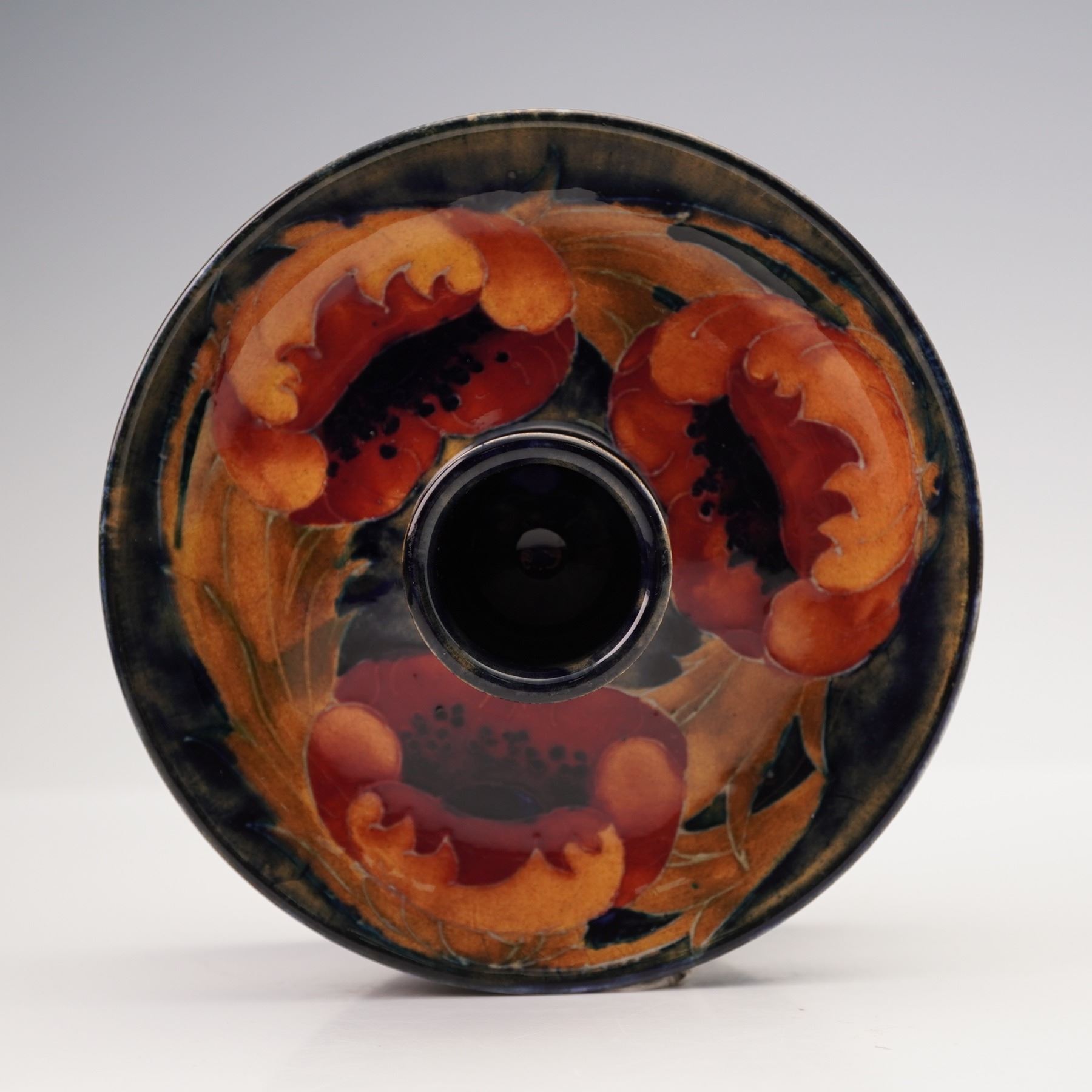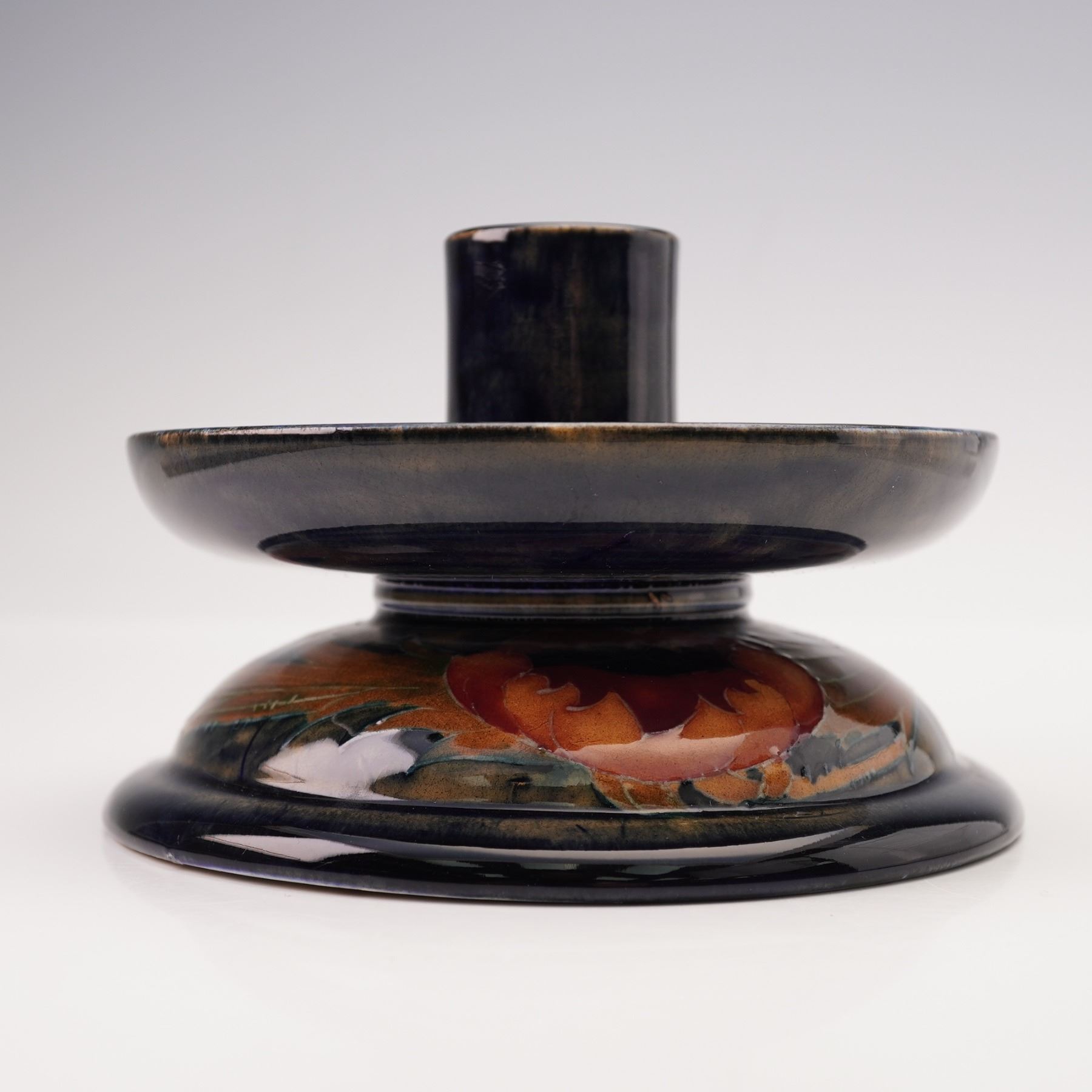 A precious pottery candle stick in double tier form decorated in the bold Big Poppy pattern. The upper and lower sections are decorated with large scarlet poppies and deep blue foliage outlined in tube-lining against a dark mottled ground. Signed "WM" to underside. Moorcroft backstamp.