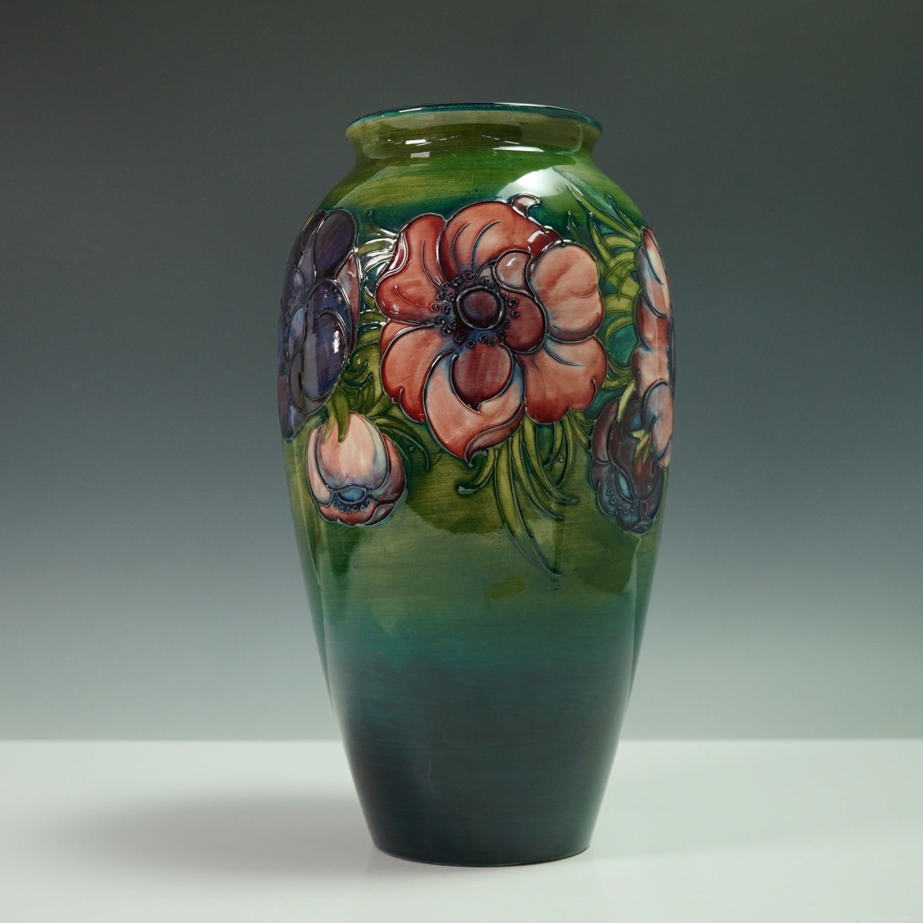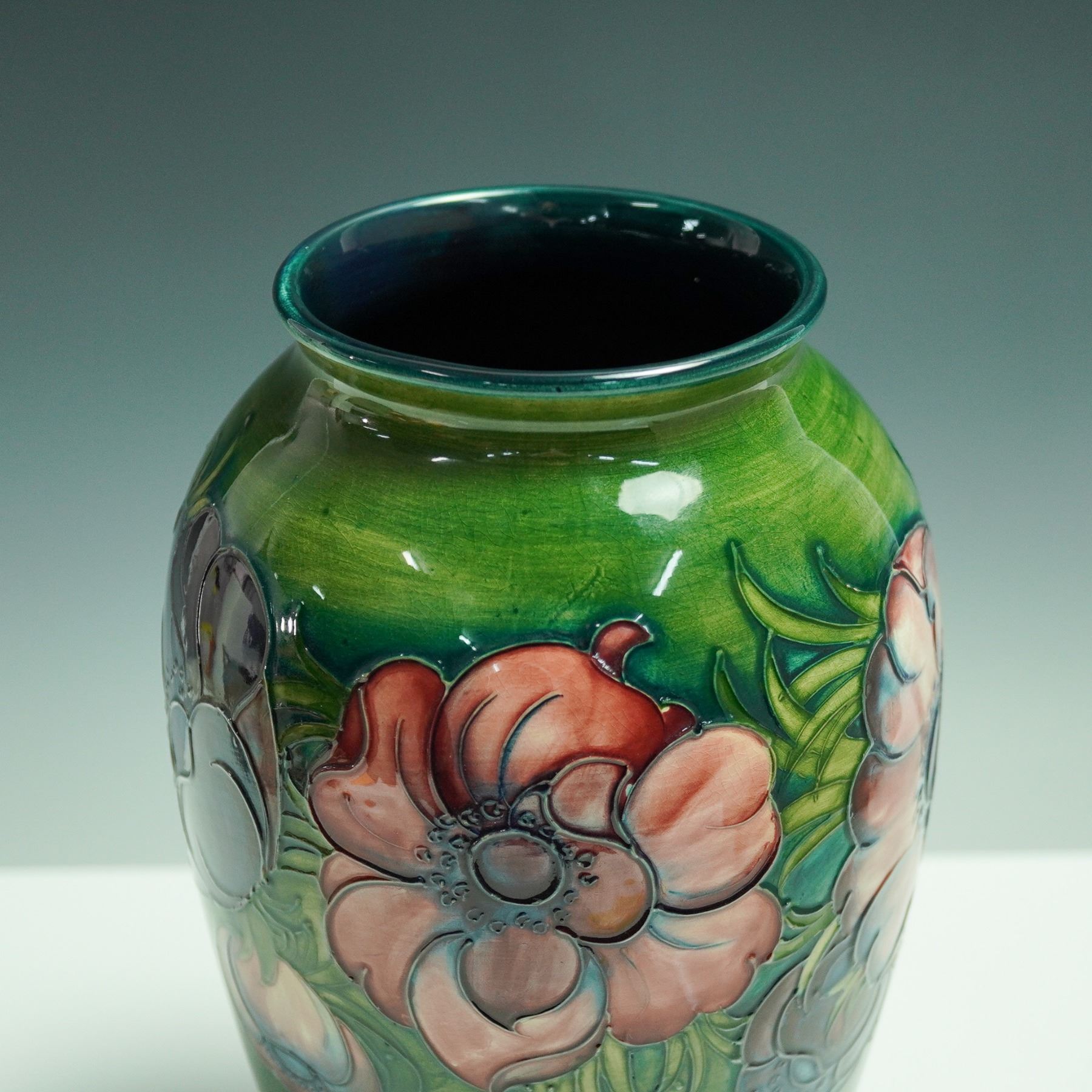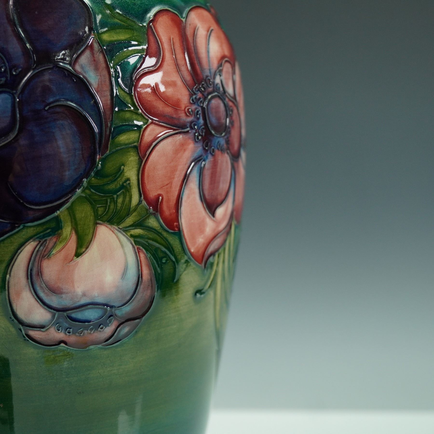 Designed by Walter Moorcroft, this baluster-form vase features tubelined anemone flowers in shades of red, purple, and blue with green foliage against a mottled green and teal ground. The vase exhibits characteristic Moorcroft glaze pooling and tonal transitions. The underside bears the Moorcroft impressed mark and signature.