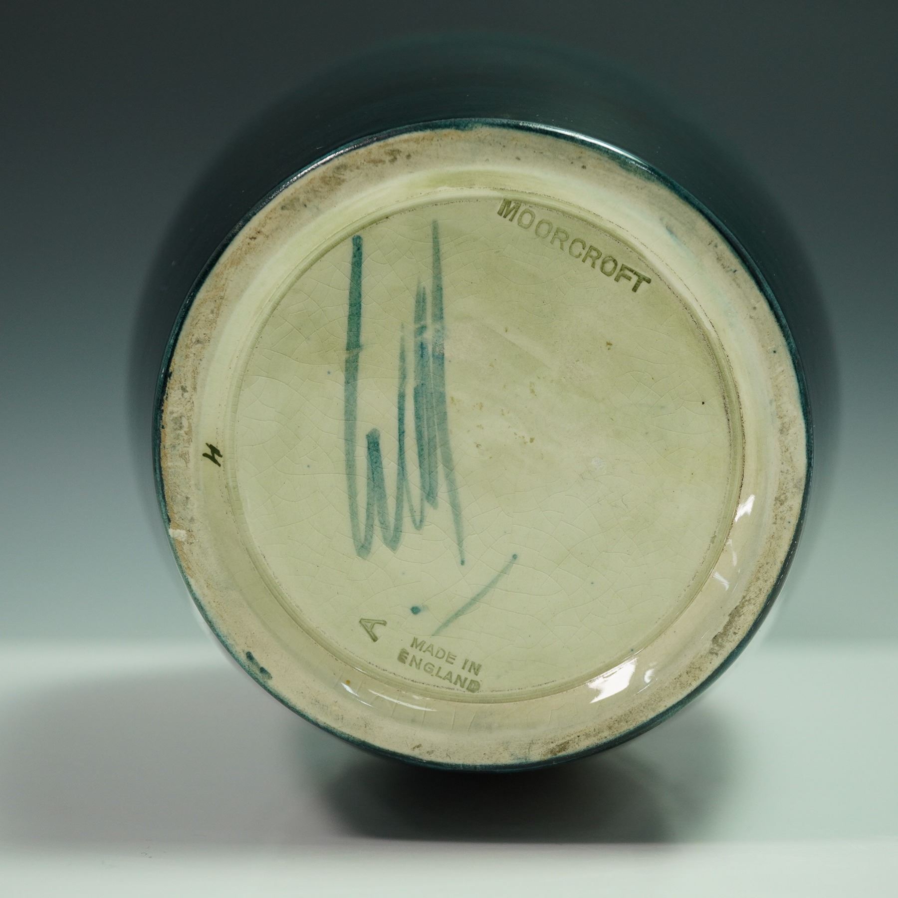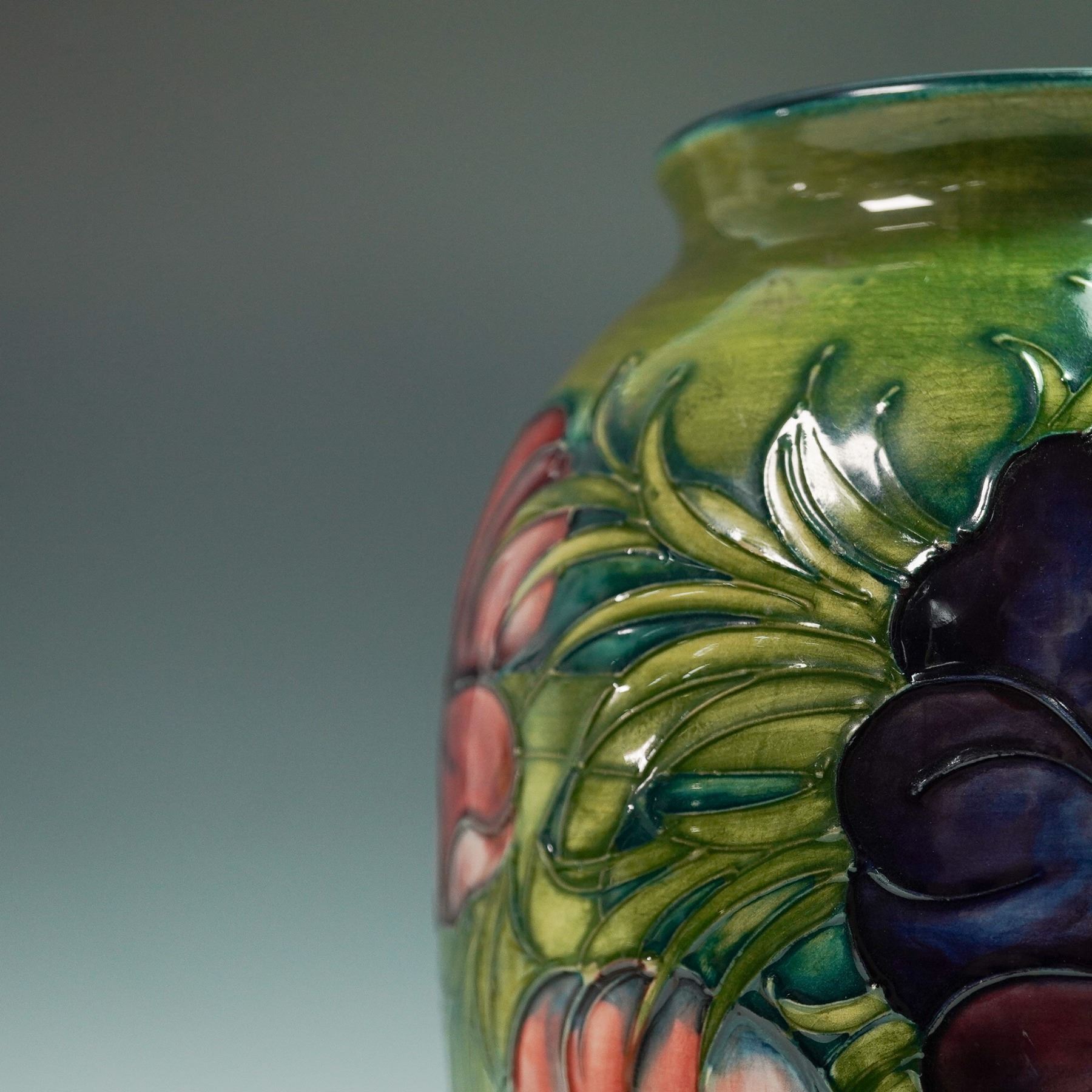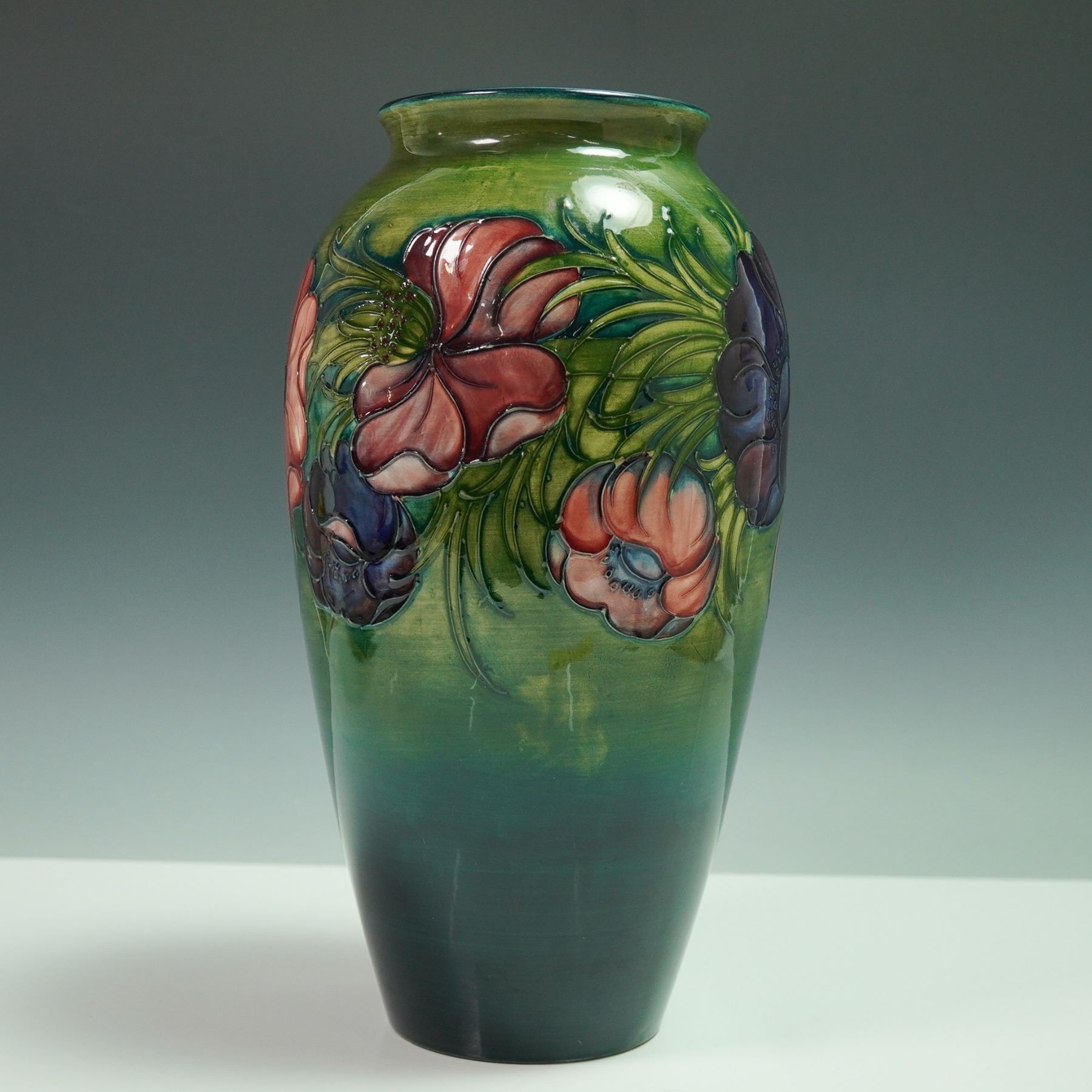 Designed by Walter Moorcroft, this baluster-form vase features tubelined anemone flowers in shades of red, purple, and blue with green foliage against a mottled green and teal ground. The vase exhibits characteristic Moorcroft glaze pooling and tonal transitions. The underside bears the Moorcroft impressed mark and signature.