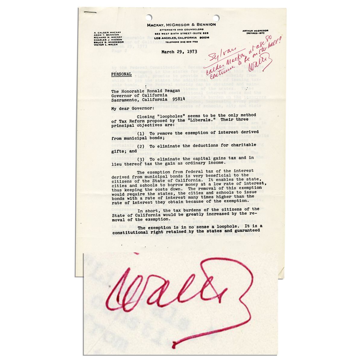 Walter O'Malley autograph note signed. Here, the former Dodgers owner signs a note on a xerographic copy of a 29 March 1973 letter to California Governor Ronald Reagan. The letter, about tax loopholes, is signed by attorney Calder Mackay, the subject of O'Malley's note to attorney and Dodgers board of directors member Sylvan Oestreicher. His red-penned note reads in full, ''Sylvan / Calder Mackay at age 80 continues to be on the ball! Walter''. 5pp. letter, stapled in upper left corner, is in near fine condition.