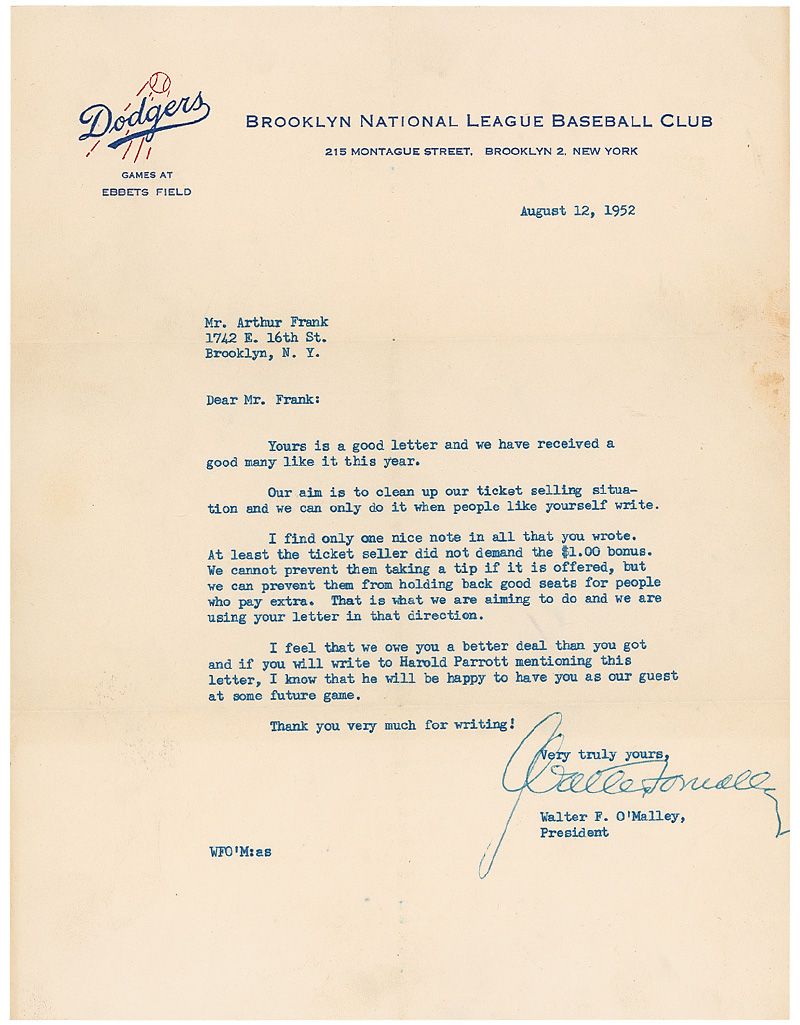 The man responsible for firing Branch Rickey and the team’s unpopular move from New York to Los Angeles. He was posthumously inducted into the Baseball Hall of Fame in 2008. TLS signed “Walter F. O’Malley,” one page, 8.5 x 11, Brooklyn Dodgers letterhead, August 12, 1952. Letter to a disgruntled ticket buyer. In part: “Our aim is to clean up our ticket selling situation and we can only do it when people like yourself write. I find only one nice note in all that you wrote. At least the ticket seller did not demand the $1.00 bonus. We cannot prevent them from taking a tip if it is offered, but we can prevent them from holding back good seats for people who pay extra…If you will write to Harold Parrott mentioning this letter, I know that he will be happy to have you as our guest at some future game.” Intersecting folds, and some light soiling to right edge, otherwise fine condition.