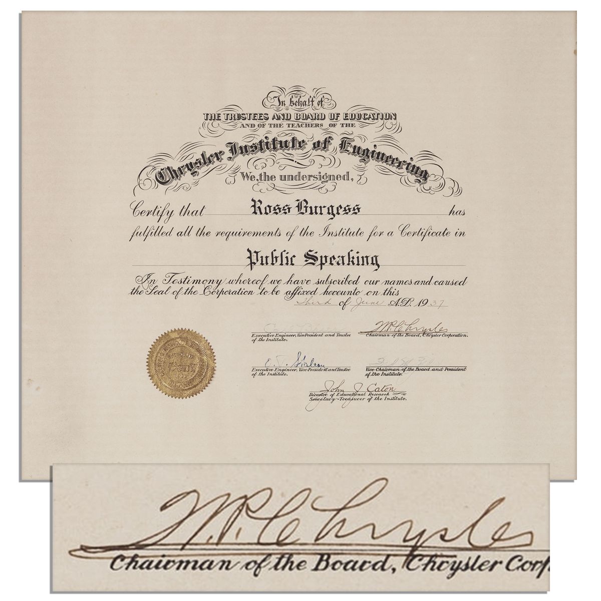 Walter P. Chrysler document signed ''W.P. Chrysler'' as Chairman of the Board, Chrysler Corporation. Partially-printed document dated 3 June 1937 grants one Ross Burgess a Chrysler Institute of Engineering certificate in Public Speaking. 1pp. measures 20'' x 17''. Toning and some dampstaining along edges, else near fine.