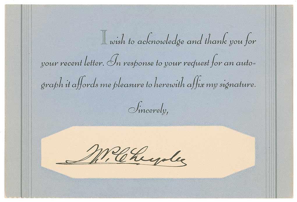Automotive mogul (1875–1940) who founded the Chrysler Corporation. Fountain pen signature, “W. P. Chrysler,” on a light blue 6 x 4 pre-printed autograph response card. In fine condition, with a bit of light edge toning.