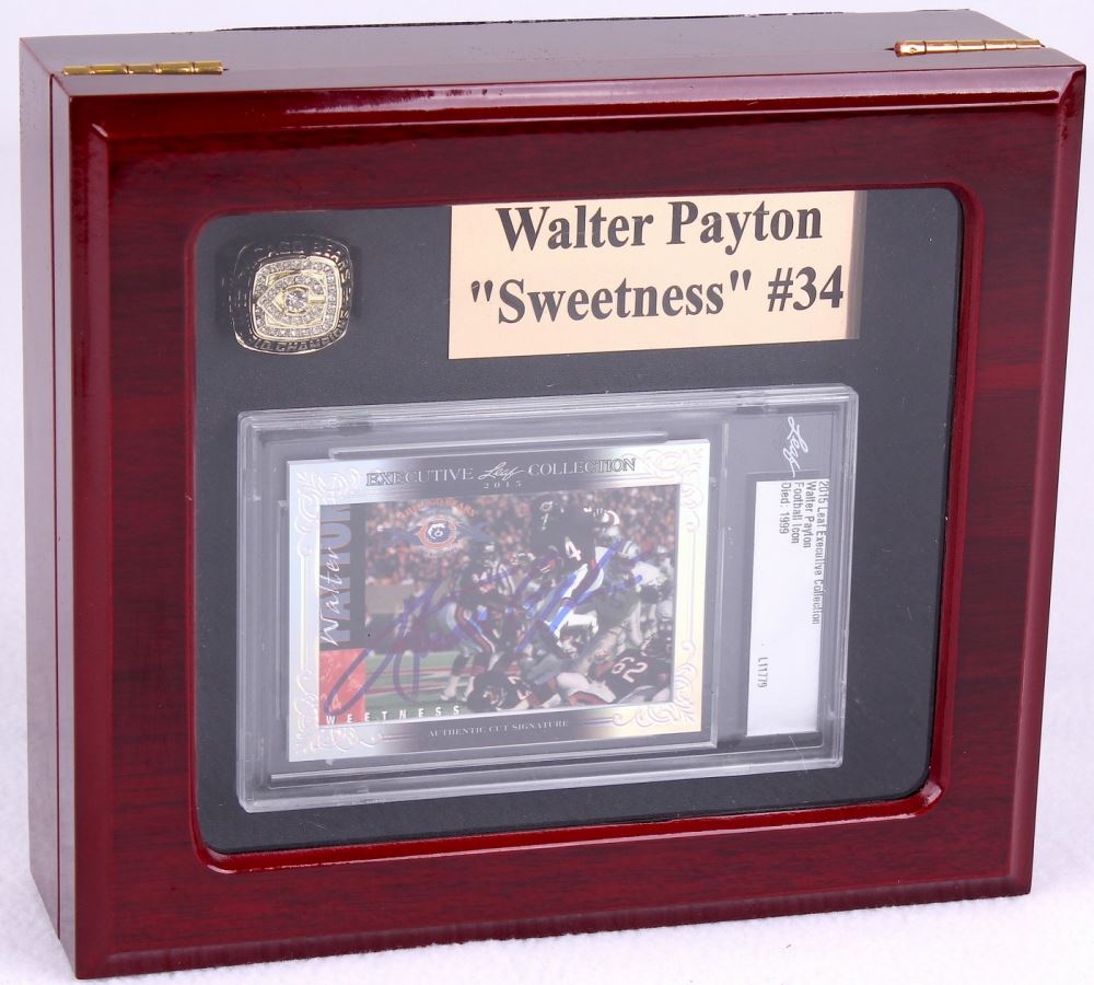 Walter Payton Bears High Quality Ring & 2015 Leaf Executive Collection Cut Signature With Piano Lacquer Wooden Display Box. 2015 Leaf Executive Collection Cut has been hand-signed in blue felt-tip pen by Walter Payton (D 1999, Bears, HOF).