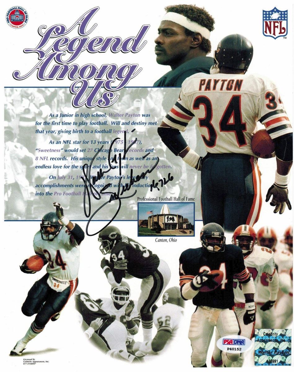 Walter Payton signed Bears "Legend Among Us" collage 8x10 photo with 'Sweetness' and '16,726' inscriptions. Item comes with a Walter Payton Foundation numbered tamper-proof hologram and has been authenticated with an invisible DNA marking, and comes with a PSA/DNA certificate of authenticity (COA) and tamper-proof numbered hologram which can be verified online.