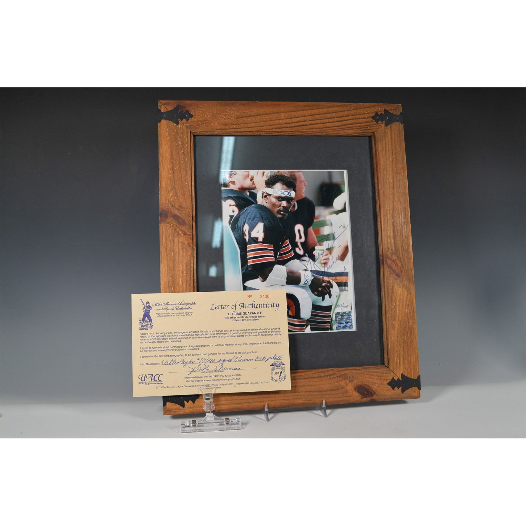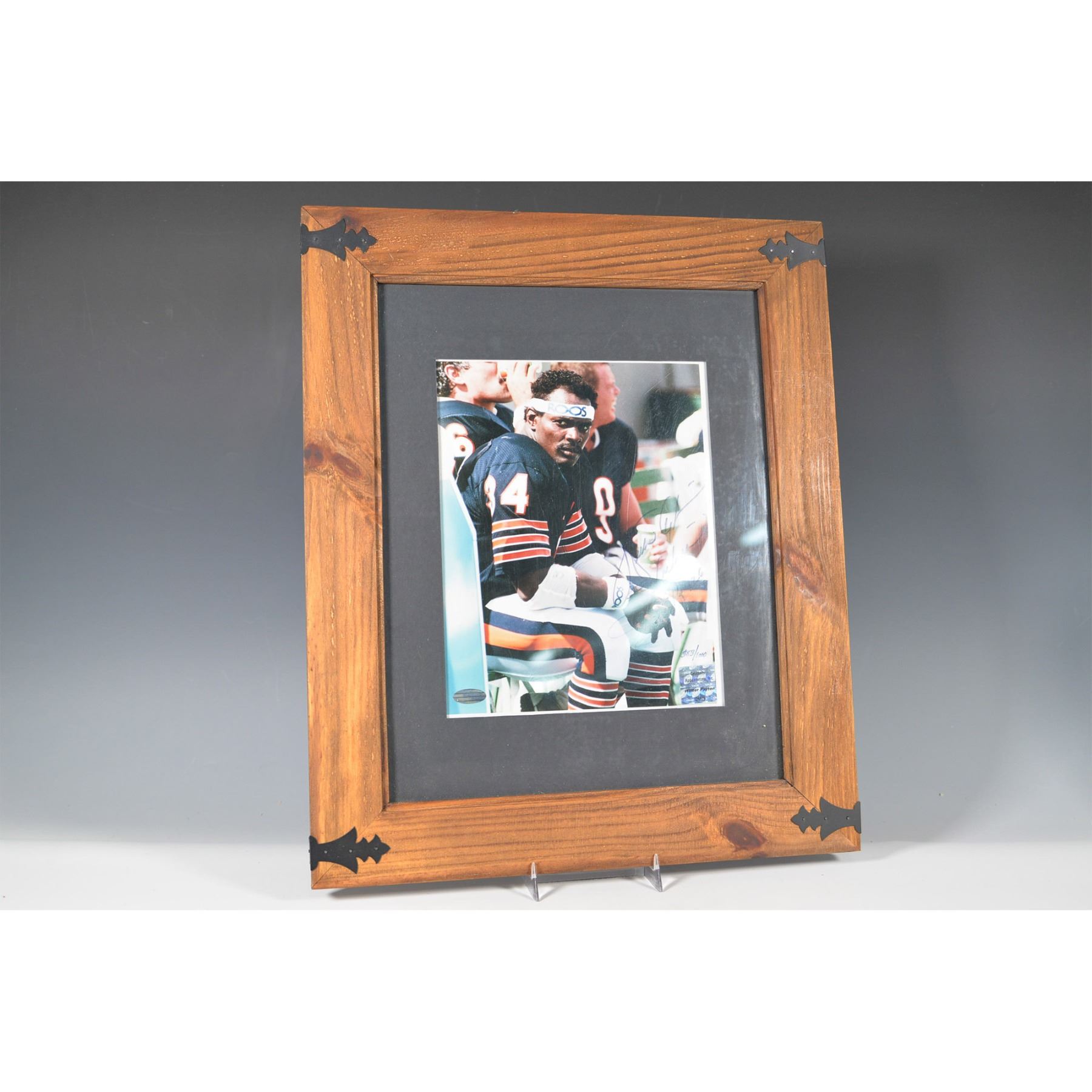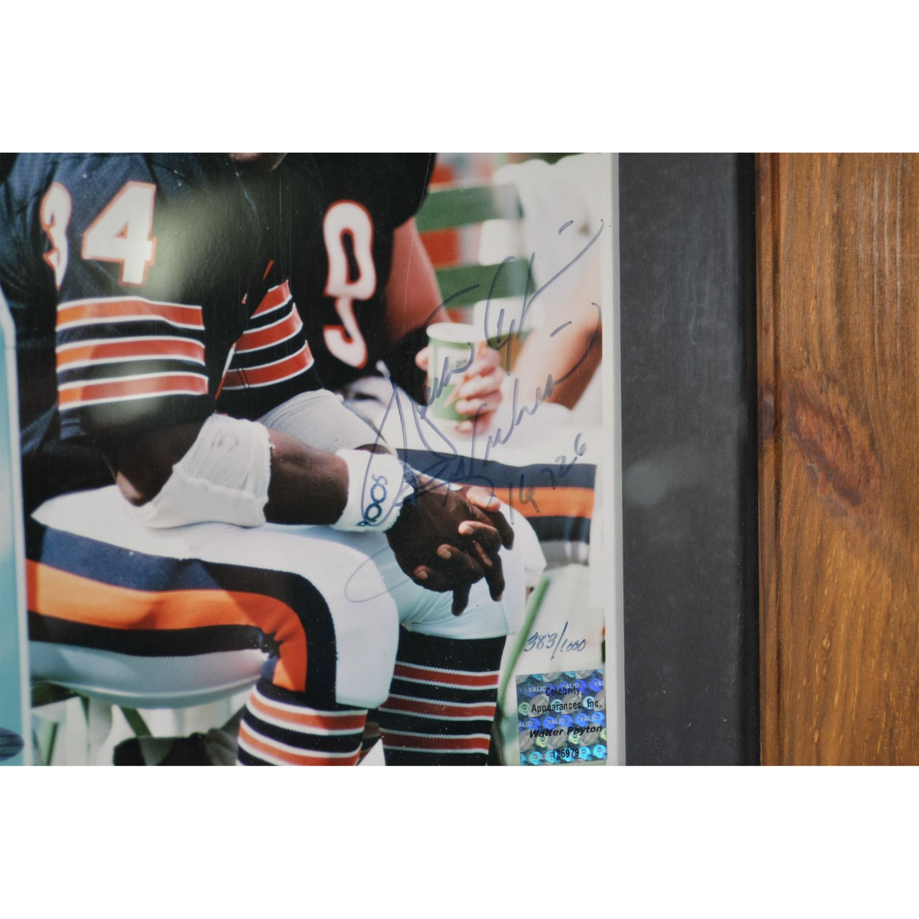 A framed, autographed photo of legendary Chicago Bears running back Walter Payton, widely regarded as one of the greatest players in NFL history. This color photograph captures Payton on the sidelines in his iconic number 34 jersey, featuring a hand-signed signature in blue ink. The photo is numbered 383/1000 and includes an official hologram sticker for authenticity. It is elegantly displayed in a rustic wooden frame with decorative metal corner accents. Accompanied by a Letter of Authenticity (LOA) from Mike Munns Autographs and Sports Collectibles, a registered dealer with the UACC (Universal Autograph Collectors Club) and IADA (International Autograph Dealers Alliance), ensuring the signature's authenticity.