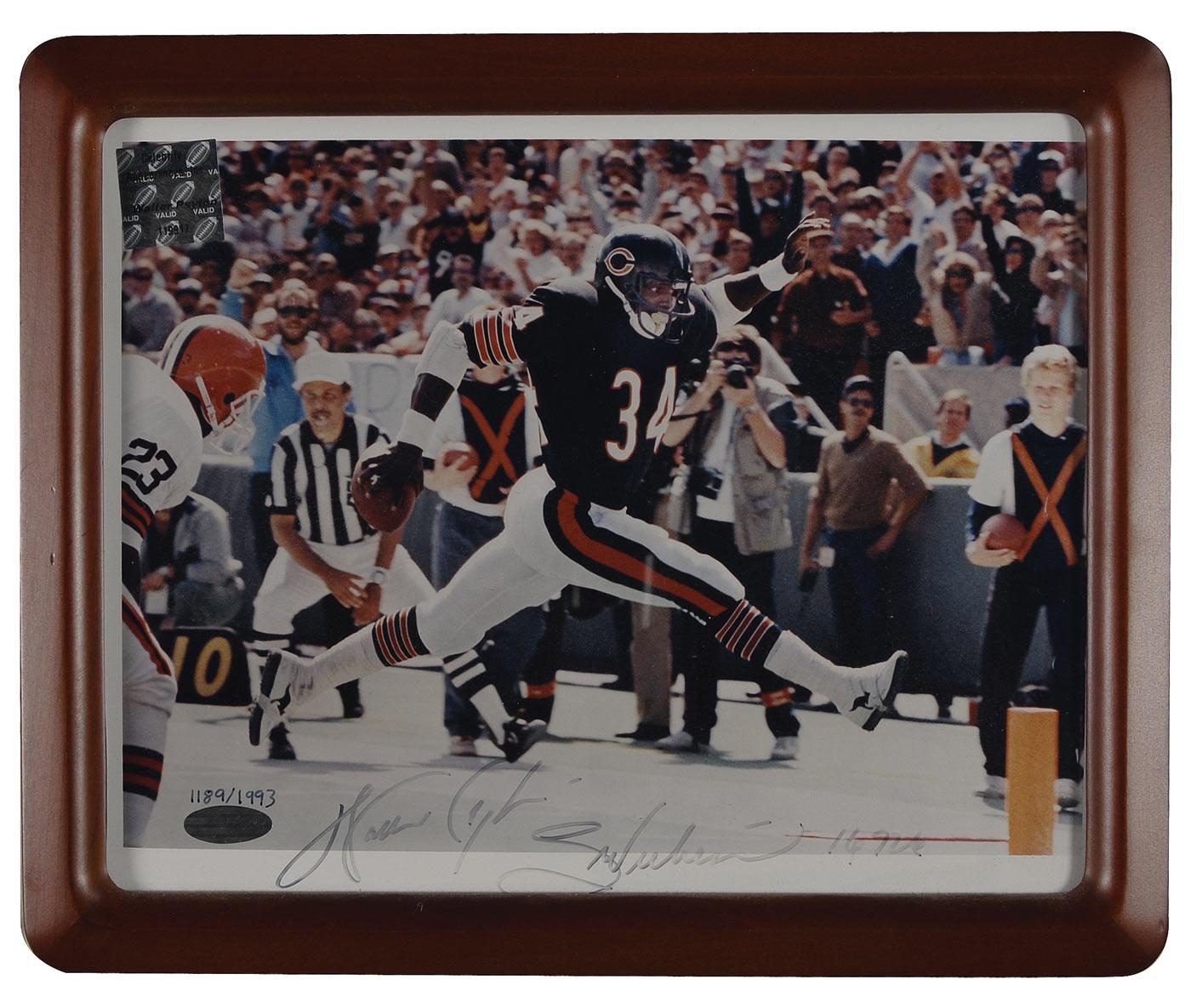 Limited edition color glossy 10 x 8 photo of Payton scoring a touchdown against the Browns, #1189/1993, signed in black felt tip, “Walter Payton, Sweetness 16726.” Framed to an overall size of 11 x 9. In fine condition, with signature a couple shades light, but completely legible.