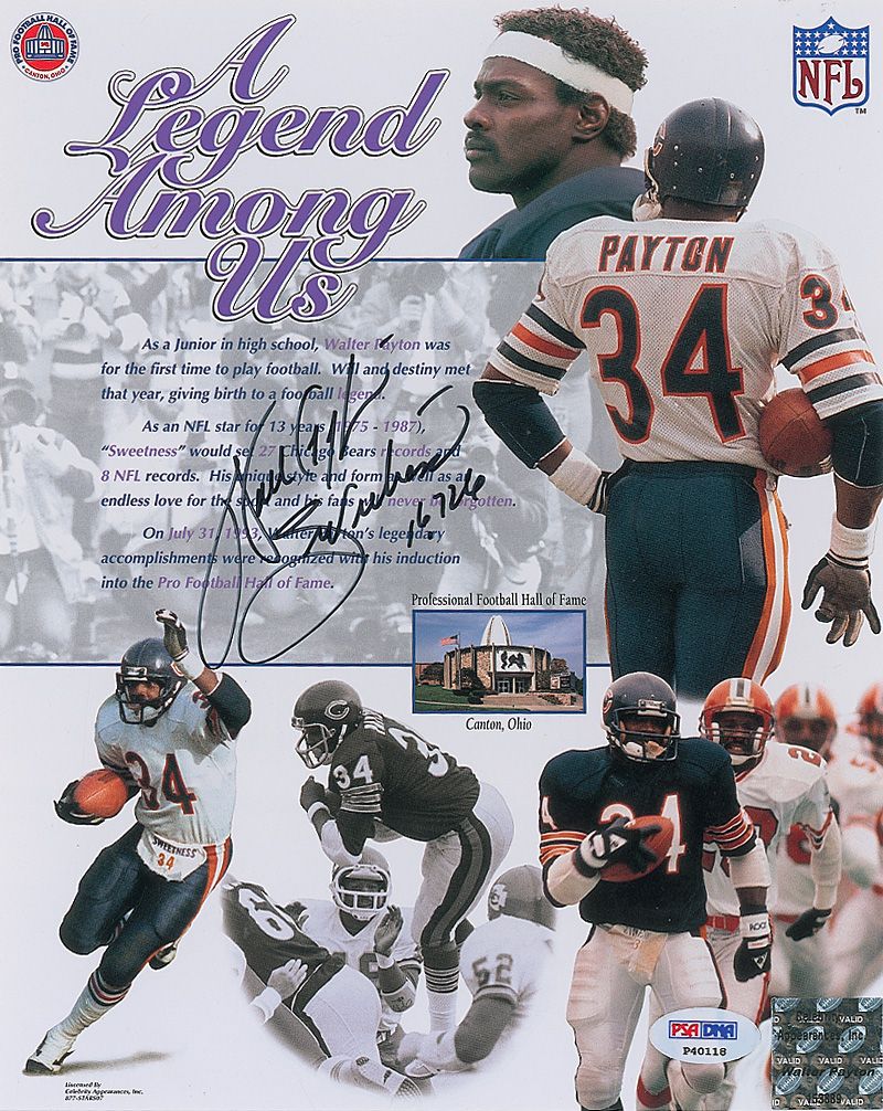 Color 8 x 10 cardstock composite photo entitled ‘A Legend Among Us’ honoring Payton’s Hall of Fame career, signed in black felt tip, “Walter Payton, Sweetness, 16,726.” In very fine condition, with a PSA/DNA label and authentication hologram affixed to the lower right corner. Accompanied by a certificate of authenticity from PSA/DNA.