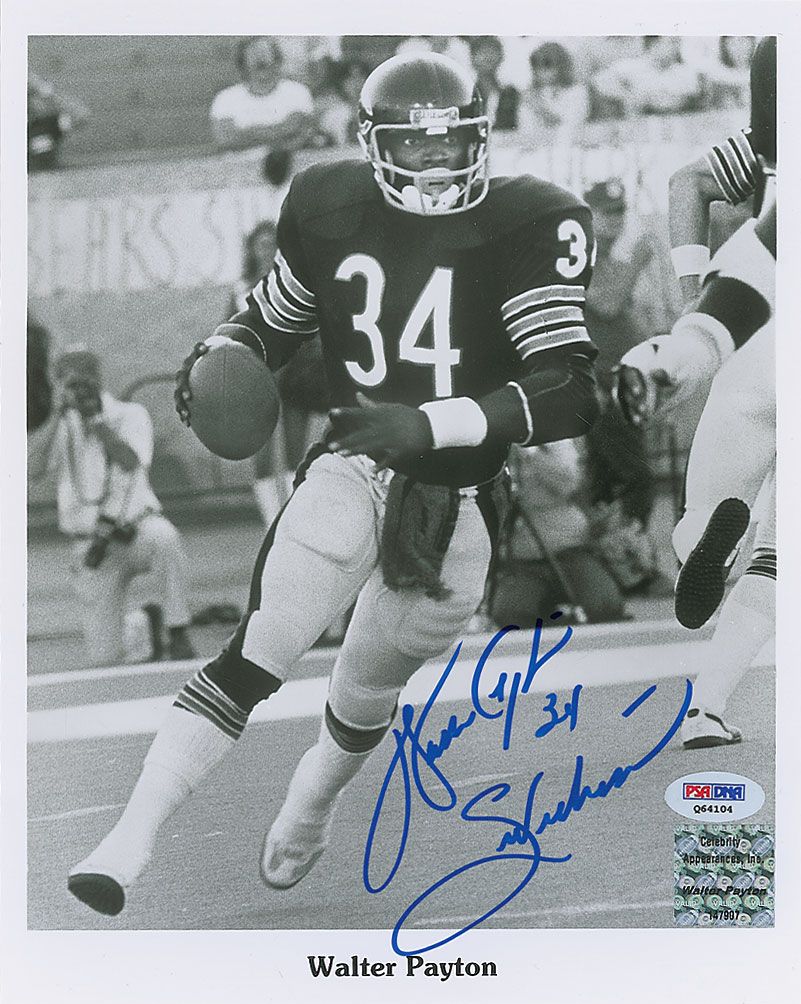 Glossy 8 x 10 photo of Payton running the ball up the field, signed in blue felt tip, “Walter Payton 34, Sweetness.” In very fine condition, with a PSA/DNA label affixed to the lower right corner. Accompanied by a certificate of authenticity from PSA/DNA.