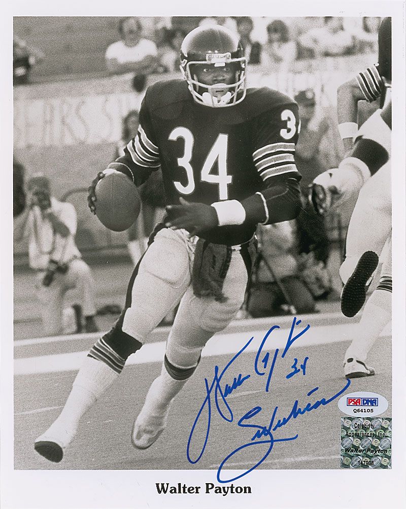 Glossy 8 x 10 photo of Payton running the ball up the field, signed in blue felt tip, “Walter Payton 34, Sweetness.” In very fine condition, with a PSA/DNA label and authentication hologram affixed to the lower right corner. Accompanied by a certificate of authenticity from PSA/DNA.