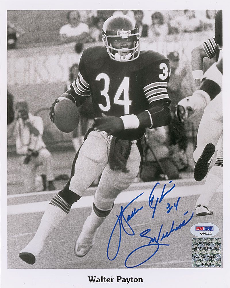Glossy 8 x 10 photo of Payton running the ball up the field, signed in blue felt tip, “Walter Payton 34, Sweetness.” In very fine condition, with a PSA/DNA label and authentication hologram affixed to the lower right corner. Accompanied by a certificate of authenticity from PSA/DNA.
