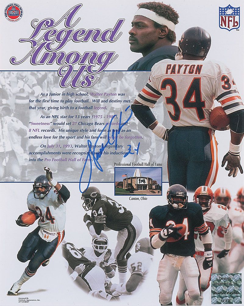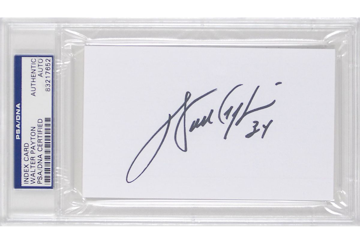 Color 8 x 10 cardstock composite photo entitled ‘A Legend Among Us’ honoring Payton’s Hall of Fame career, signed in blue felt tip, “Walter Payton, 34”; and a black felt tip signature, “Walter Payton, 34,” on a white 5 x 3 card, encapsulated in a plastic PSA/DNA authentication holder. In overall fine condition.