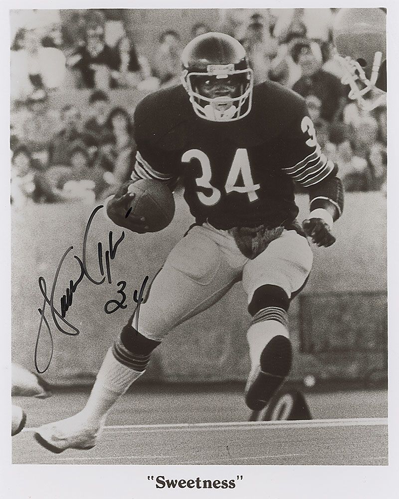 Glossy 8 x 10 photo of Payton carrying the ball for the Bears, signed in black felt tip, “Walter Payton 34.” In fine condition.
