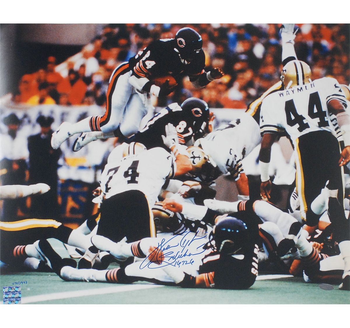 Color satin-finish 20 x 16 photo of Payton hurdling over the line, signed in blue felt tip, “Walter Payton, Sweetness, 16,726.” In fine condition, with a Steiner label affixed to the lower right (certificate of authenticity not present).