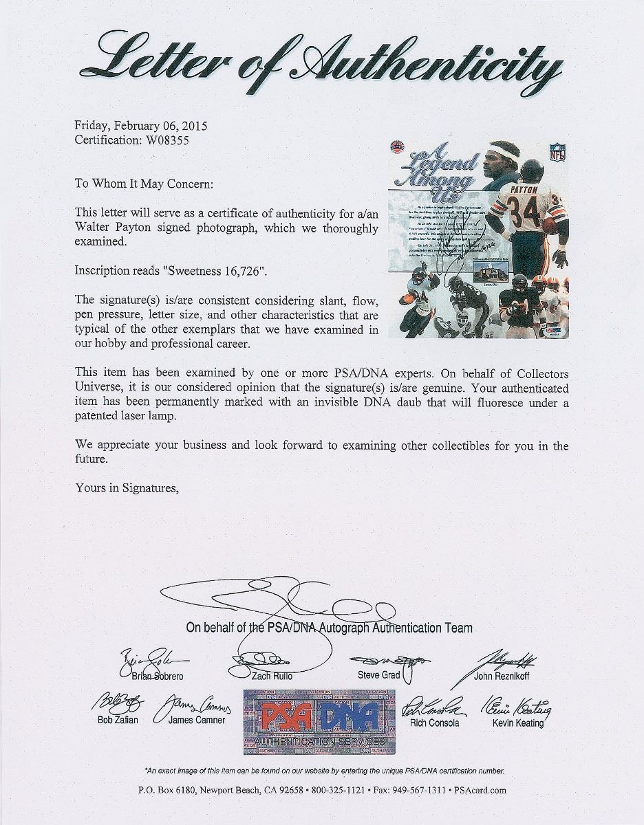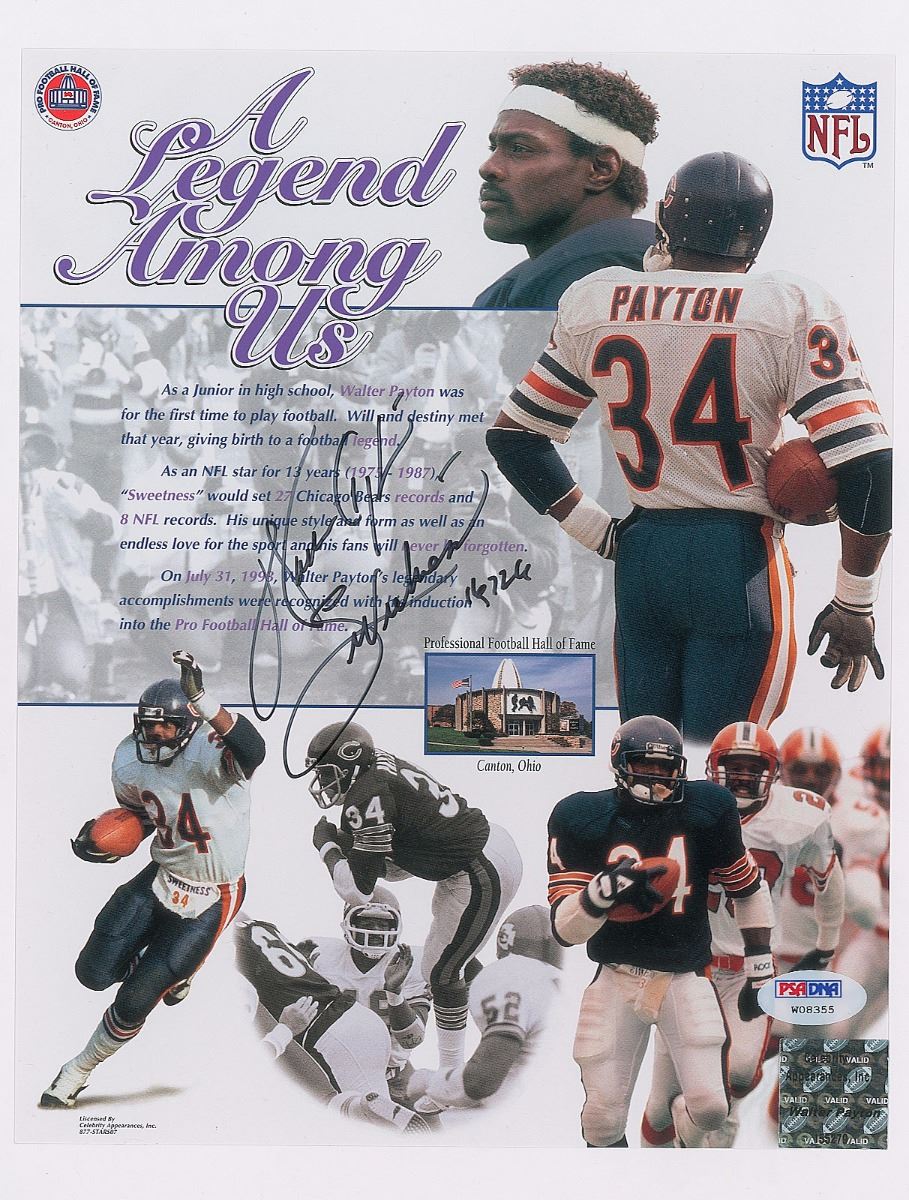 Color 8 x 10 cardstock composite photo entitled ‘A Legend Among Us’ honoring Payton’s Hall of Fame career, signed in black felt tip, “Walter Payton, Sweetness, 16,726.” In fine condition, with a PSA/DNA label affixed to the lower corner. Accompanied by a full letter of authenticity from PSA/DNA.