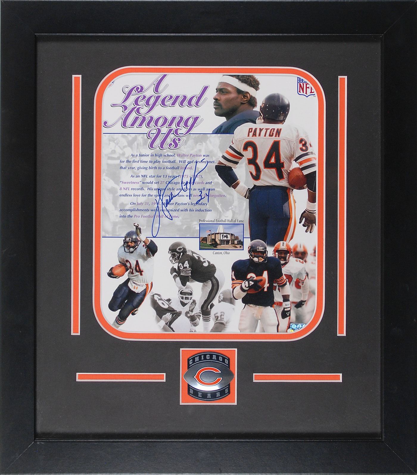 Color 7.5 x 9 cardstock composite photo entitled ‘A Legend Among Us’ honoring Payton’s Hall of Fame career, signed in blue felt tip, “Walter Payton, 34.” Nicely double-matted and framed with a Chicago Bears emblem to an overall size of 14.5 x 16.5. In fine condition.