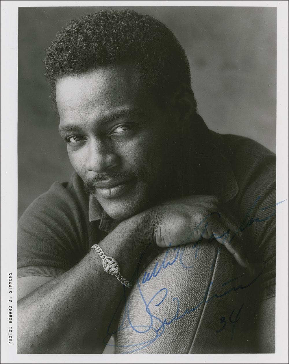 Glossy 8 x 10 photo of Payton leaning on a football, signed in blue felt tip, “Walter Payton, Sweetness 34.” In fine condition, with light contrast to signature.
